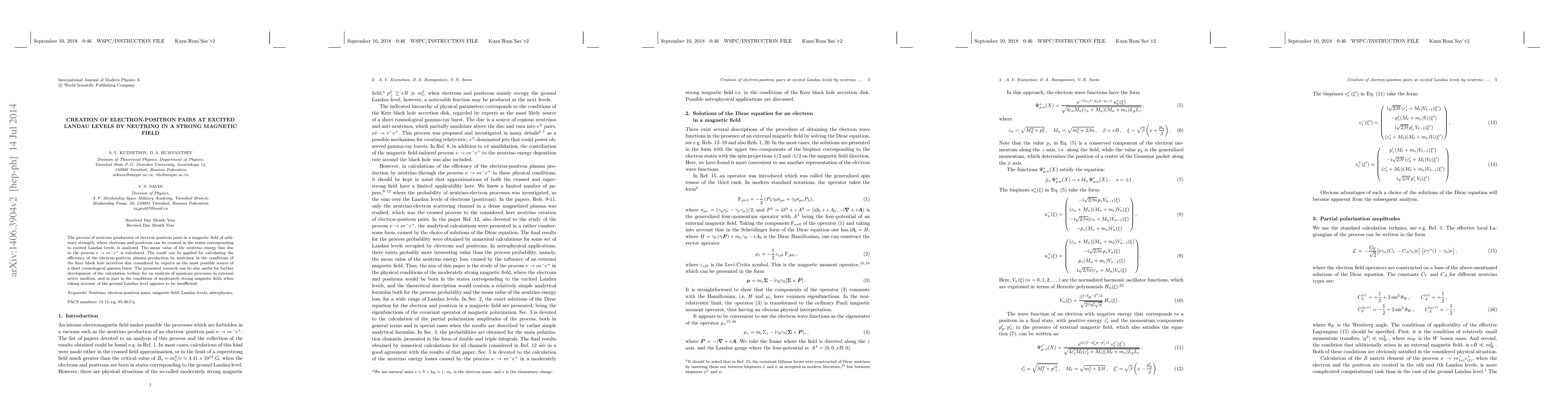 This paper analyzes the production of electron-positron pairs by neutrinos in strong magnetic fields, where pairs can occupy excited Landau levels, and calculates the mean energy loss of neutrinos through this process. The findings are relevant for assessing the efficiency of electron-positron plasma production in Kerr black hole accretion discs, potentially explaining short cosmological gamma bursts.