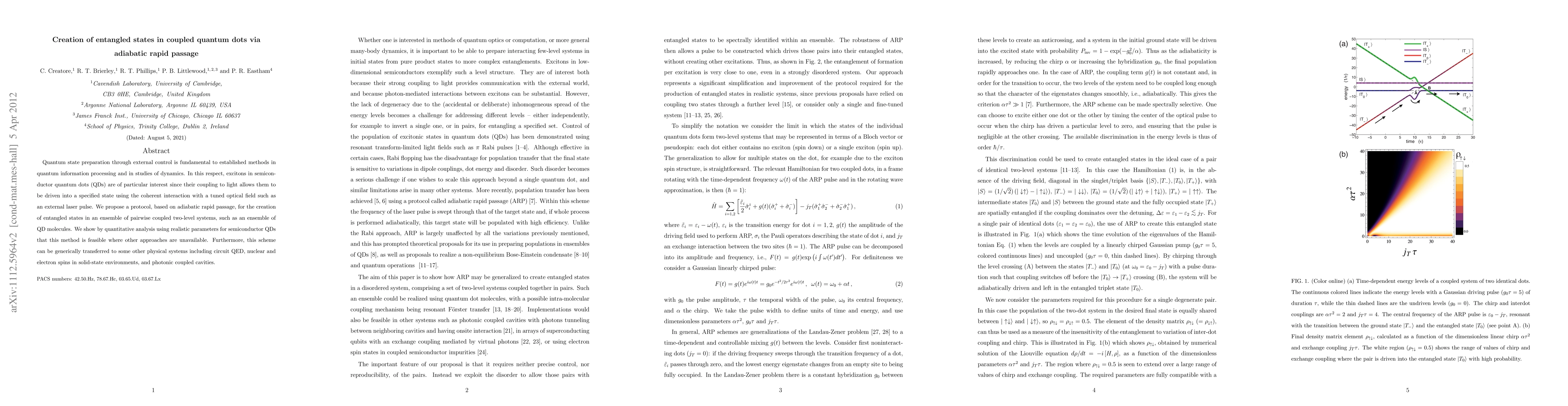 This paper proposes a protocol using adiabatic rapid passage for creating entangled states in coupled quantum dots, demonstrating its feasibility through quantitative analysis and suggesting its applicability to other quantum systems like circuit QED and solid-state spins. The method leverages the coherent interaction of excitons in semiconductor quantum dots with an external laser pulse.