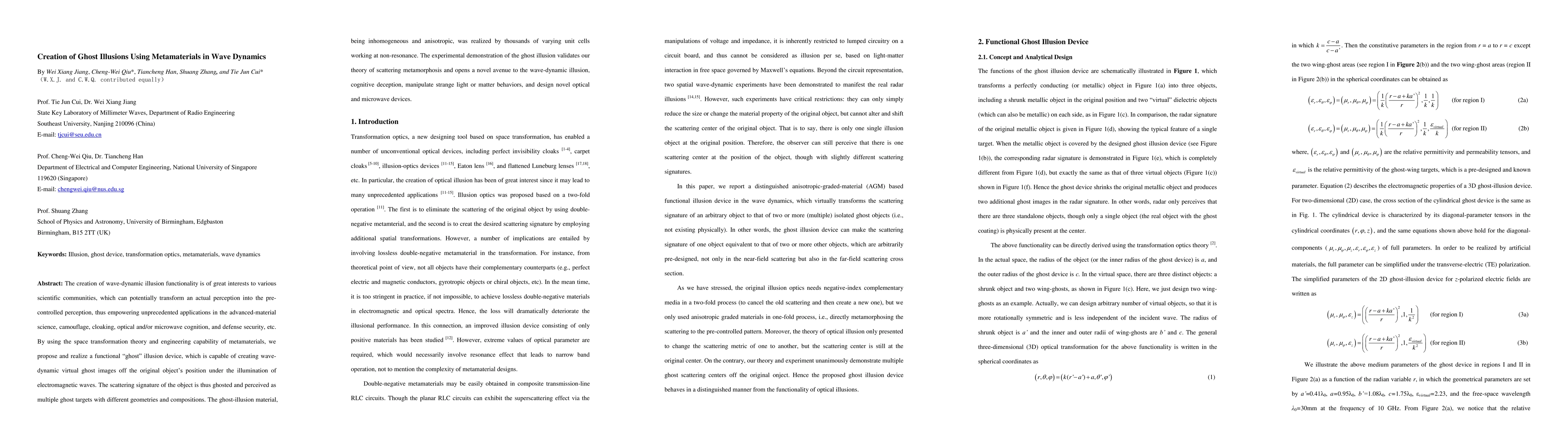 This paper proposes a metamaterial-based device that creates wave-dynamic ghost illusions by manipulating electromagnetic wave scattering, enabling the perception of virtual ghost images. The experimental validation demonstrates the potential for advanced applications in material science, camouflage, and defense security.