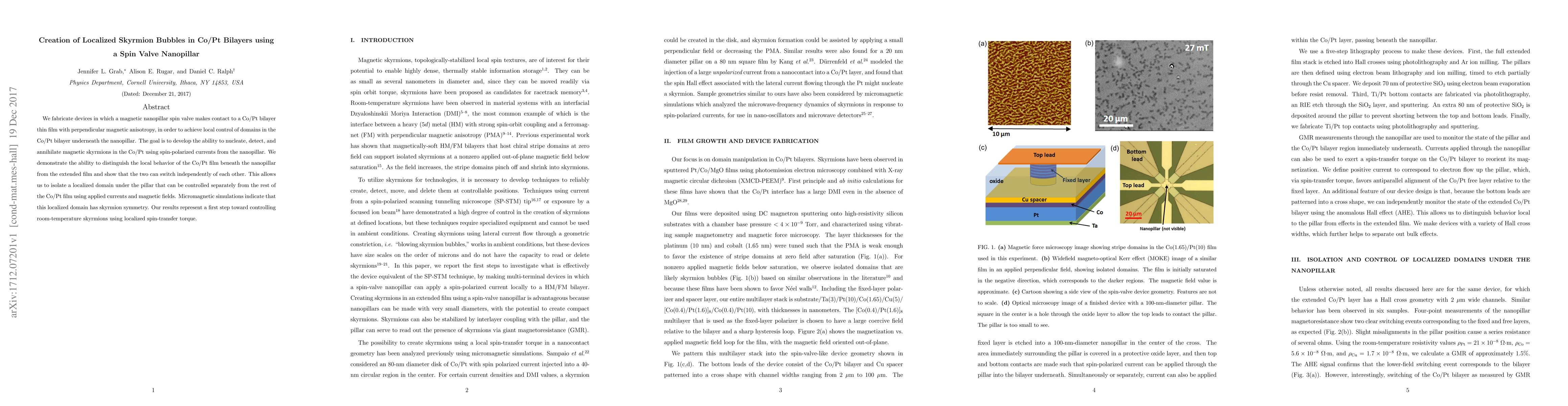 Researchers create localized skyrmion bubbles in Co/Pt bilayers using spin valve nanpillars, demonstrating controlled domain switching at room temperature.