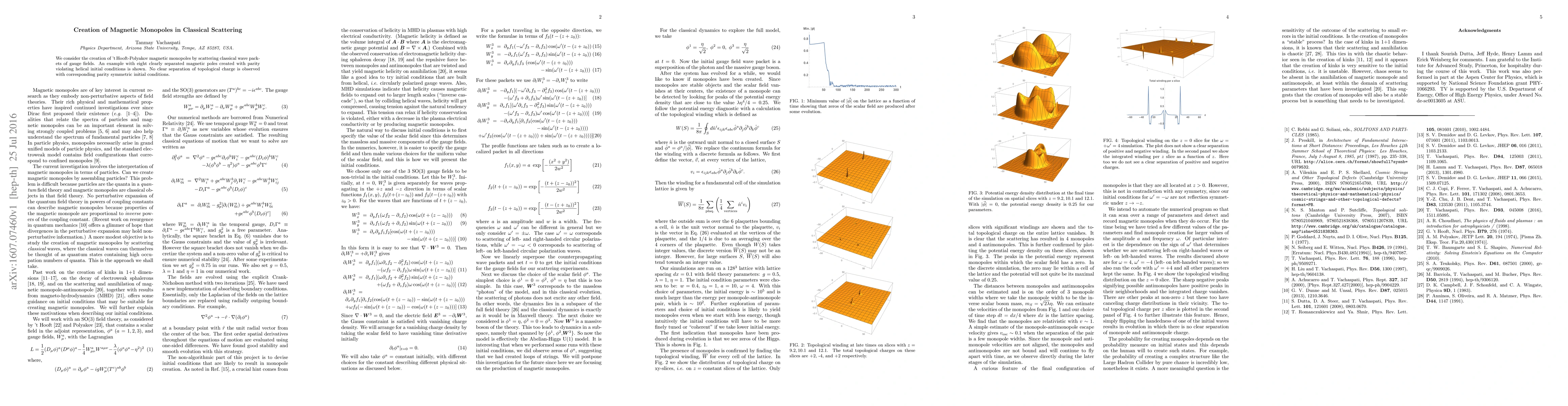 This paper investigates the generation of 't Hooft-Polyakov magnetic monopoles through the scattering of classical gauge field wave packets, demonstrating the creation of eight distinct magnetic poles with parity-violating helical initial conditions, while no clear monopole formation occurs with parity-symmetric conditions.