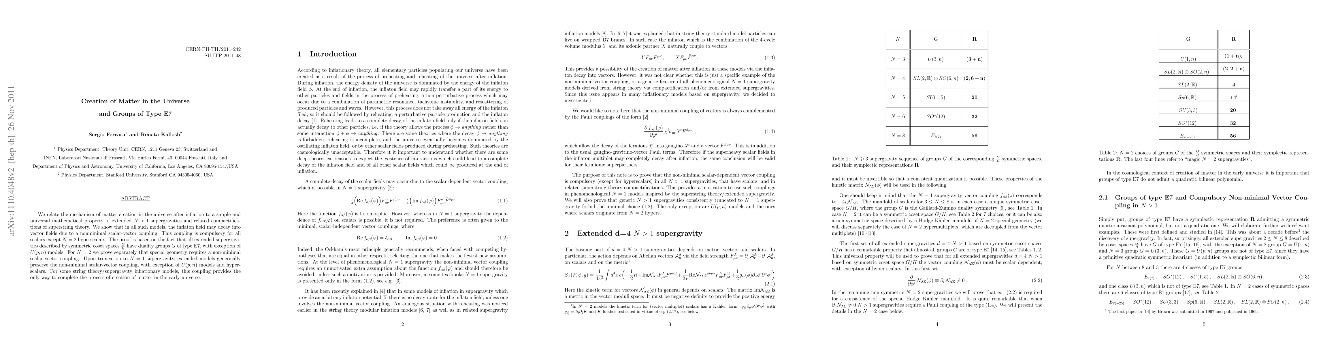 This paper explores the mechanism of matter creation in the universe post-inflation, linking it to the mathematical property of extended supergravities and superstring theory compactifications. It reveals that the inflaton field can decay into vector fields due to a nonminimal scalar-vector coupling, which is essential for most scalars except N=2 hyperscalars, and is supported by the duality groups G of type E7.