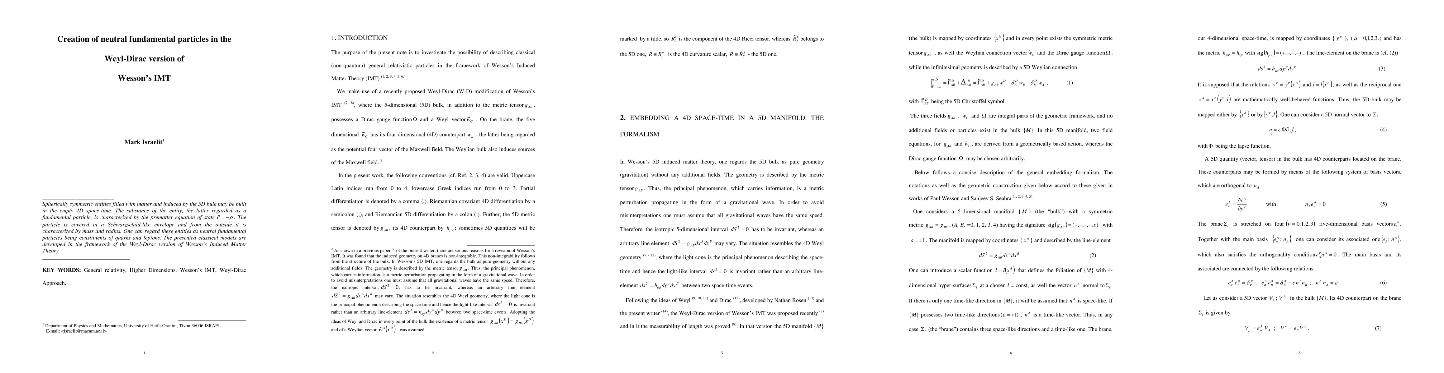 The paper introduces classical models of neutral fundamental particles using the Weyl-Dirac modification of Wesson's IMT, demonstrating the creation of particles through the geometry of a 5D Bulk.