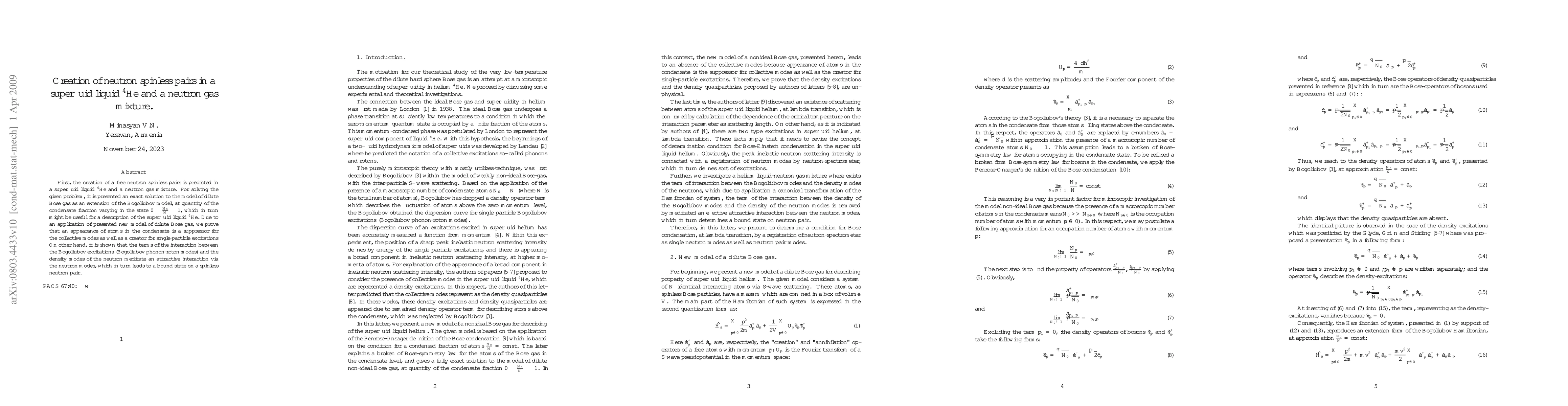 First, the creation of a free neutron spinless pairs is predicted in a superfluid liquid $^4$He and a neutron gas mixture. For solving the given problem, it is presented an exact solution to the model of dilute Bose gas as an extension of the Bogoliubov model, at quantity of the condensate fraction varying in the state $0\leq\frac{N_0}{N}\leq 1$, which in turn might be useful for a description of the superfluid liquid $^4$He. Due to an application of presented new model of dilute Bose gas, we prove that an appearance of atoms in the condensate is a suppressor for the collective modes as well as a creator for single-particle excitations On other hand, it is shown that the terms of the interaction between the Bogoliubov excitations (Bogoliubov phonon-roton modes) and the density modes of the neutron meditate an attractive interaction via the neutron modes, which in turn leads to a bound state on a spinless neutron pair.