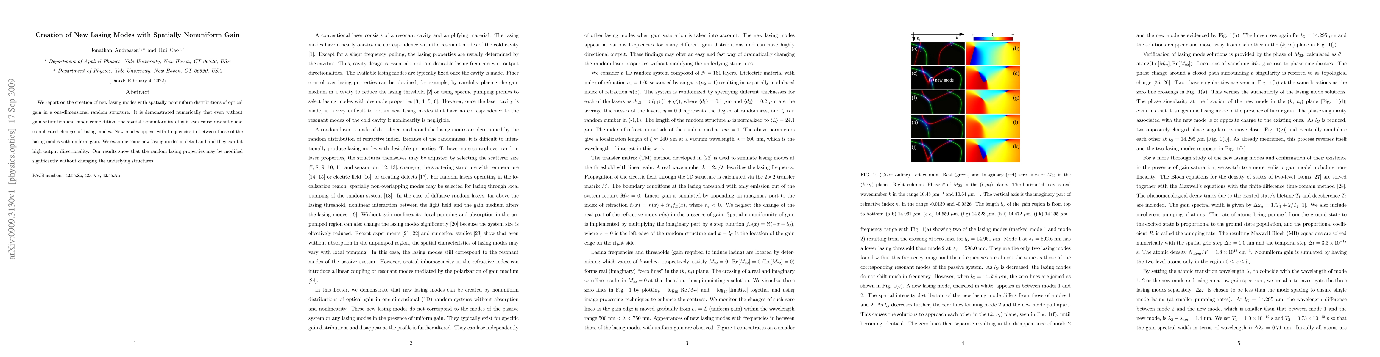 This paper demonstrates the creation of new lasing modes in a one-dimensional random structure with spatially nonuniform optical gain, showing dramatic and complex changes in lasing modes without gain saturation or mode competition. The study reveals that these new modes exhibit high output directionality and suggests that random lasing properties can be significantly altered without modifying the underlying structure.