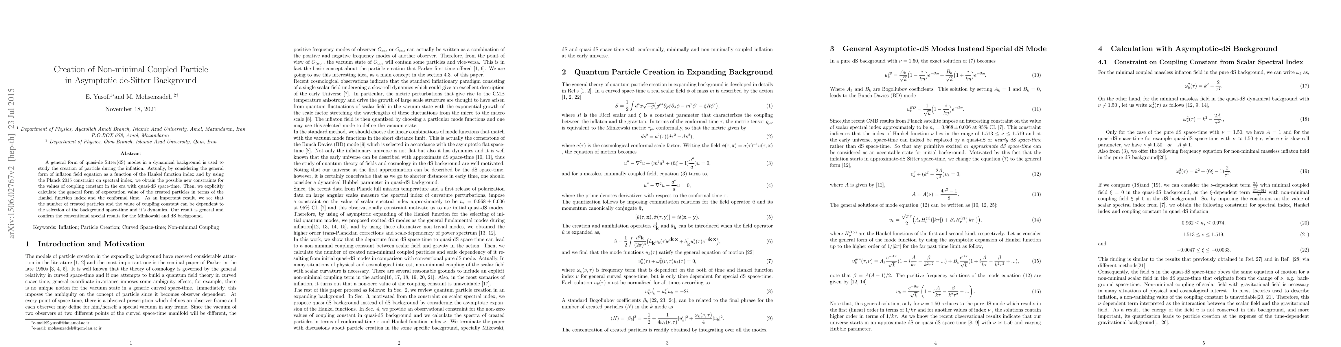 A general form of quasi-de Sitter(dS) modes in a dynamical background is used to study the creation of particle during the inflation. Actually, by considering the general form of inflaton field equation as a function of the Hankel function index and by using the Planck 2015 constraint on spectral index, we obtain the possible new constraints for the values of coupling constant in the era with quasi-dS space-time. Then, we explicitly calculate the general form of expectation value of the created particles in terms of the Hankel function index and the conformal time. As an important result, we see that the number of created particles and the value of coupling constant can be dependent to the selection of the background space-time and it's dynamics. Our result is general and confirm the conventional special results for the Minkowski and dS background.