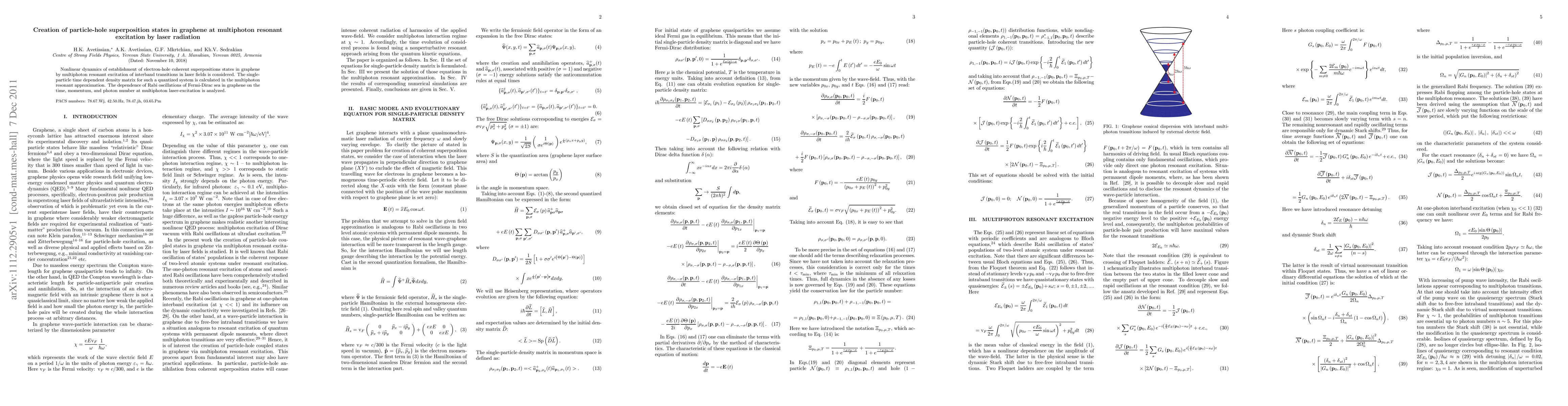This paper investigates the nonlinear dynamics of creating electron-hole superposition states in graphene via multiphoton resonant excitation by laser fields, calculating the single-particle time-dependent density matrix and analyzing Rabi oscillations' dependence on time, momentum, and photon number.