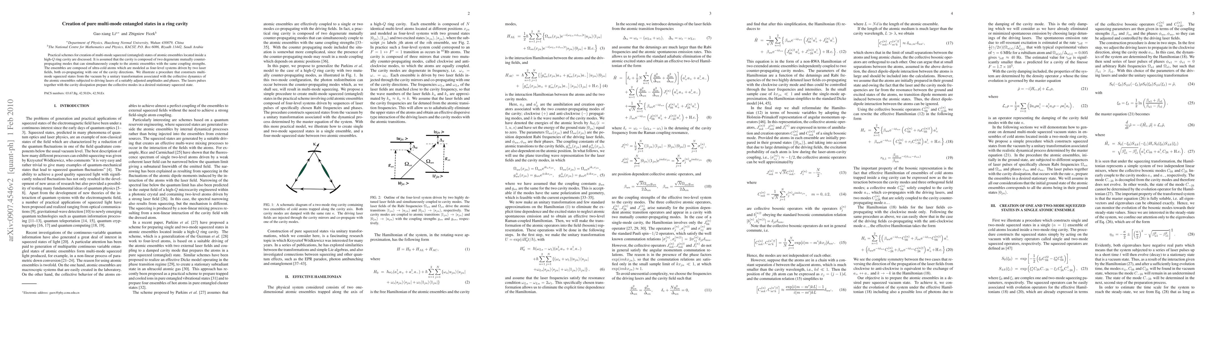 This paper discusses practical schemes for generating multi-mode entangled states within a high-Q ring cavity using ultra-cold atomic ensembles. The method involves creating multi-mode squeezed states through a unitary transformation driven by appropriately adjusted laser fields, leading to a desired stationary squeezed state.