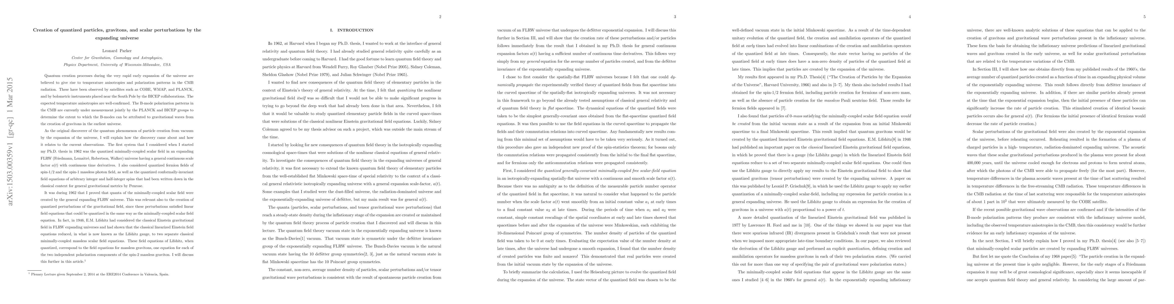 The paper presents detailed derivations and methods for calculating the number of quantized particles and gravitons created by an expanding universe, building upon earlier work by Lifshitz and Parker's own research on particle creation in FLRW universes.
