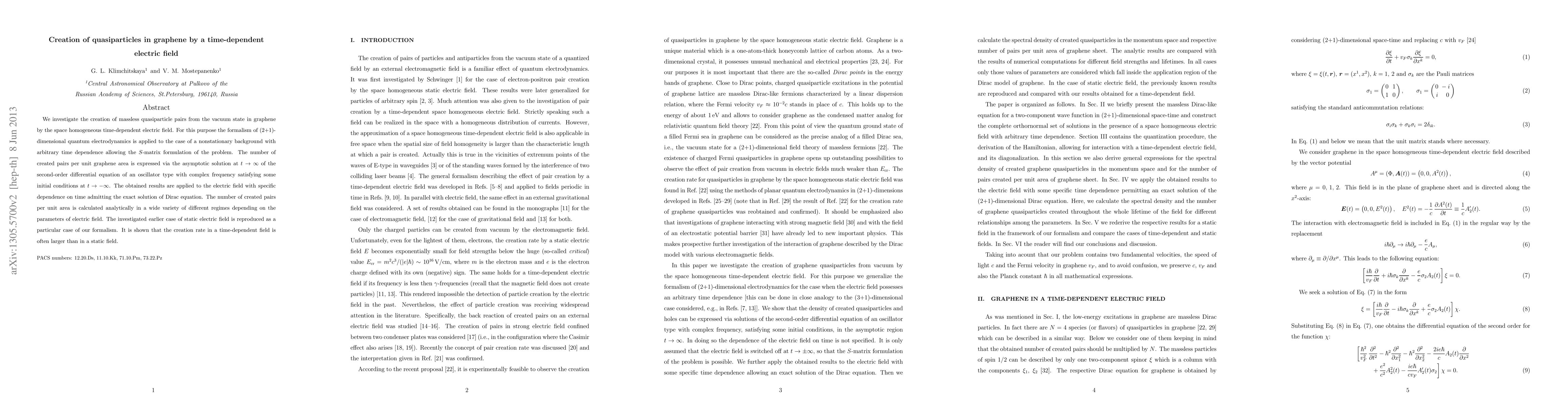 This paper explores the generation of massless quasiparticles in graphene induced by a time-varying electric field using 2+1-dimensional quantum electrodynamics. The study finds that the quasiparticle creation rate is often greater in dynamic fields compared to static ones, with analytical results applicable to various field configurations.