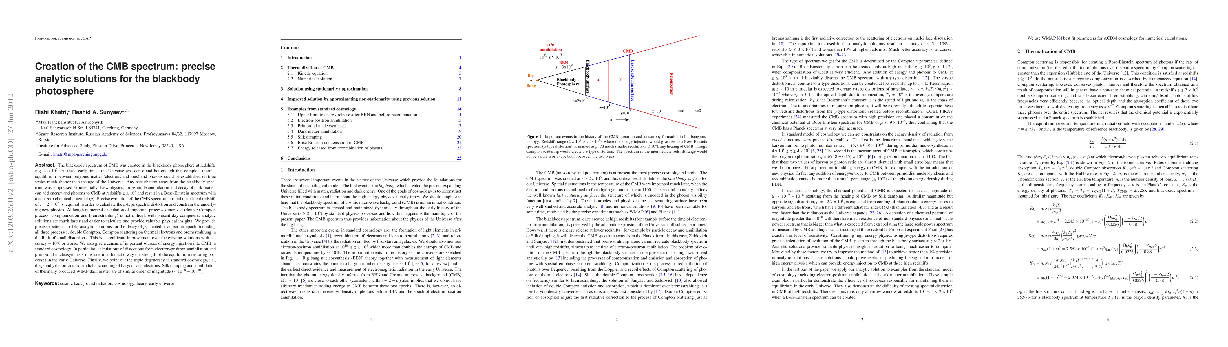 This paper presents precise analytic solutions for the blackbody spectrum of the Cosmic Microwave Background (CMB) created at high redshifts, providing better than 1% accuracy. It focuses on the evolution of the CMB spectrum around z~2x10^6, detailing the decay of non-zero chemical potential ($\mu$) and energy injection sources, offering insights into early Universe processes and constraints on new physics.