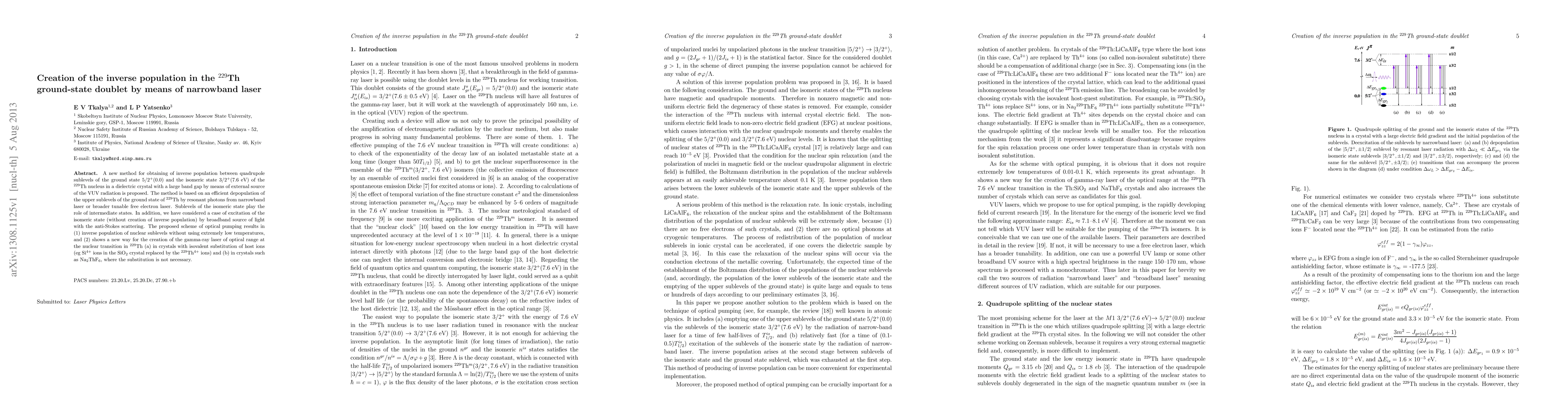 This paper proposes a novel method to achieve inverse population between the quadrupole sublevels of the ground state and the isomeric state of $^{229}$Th using VUV radiation in a dielectric crystal. The method employs resonant photons from a narrowband laser or a tunable free electron laser, enabling the creation of an optical pumping scheme that results in inverse population without extreme cooling and potential gamma-ray laser development.