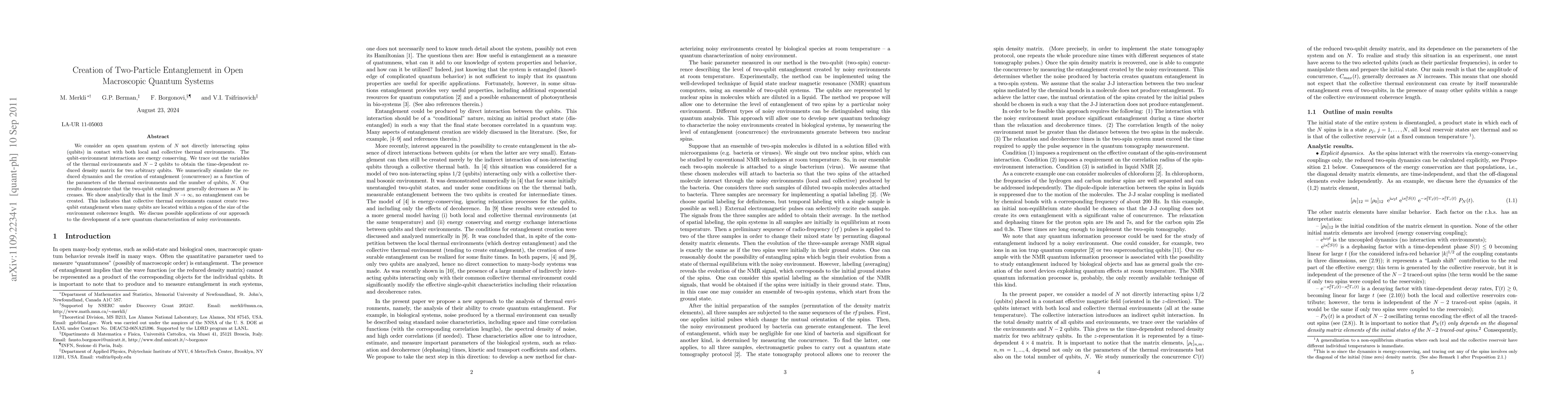 This paper investigates the creation of two-particle entanglement in open macroscopic quantum systems of N qubits interacting with thermal environments. The study finds that entanglement decreases with increasing N, and analytically proves that no entanglement can be created when N approaches infinity, indicating limitations in using collective thermal environments for entanglement generation in large systems.