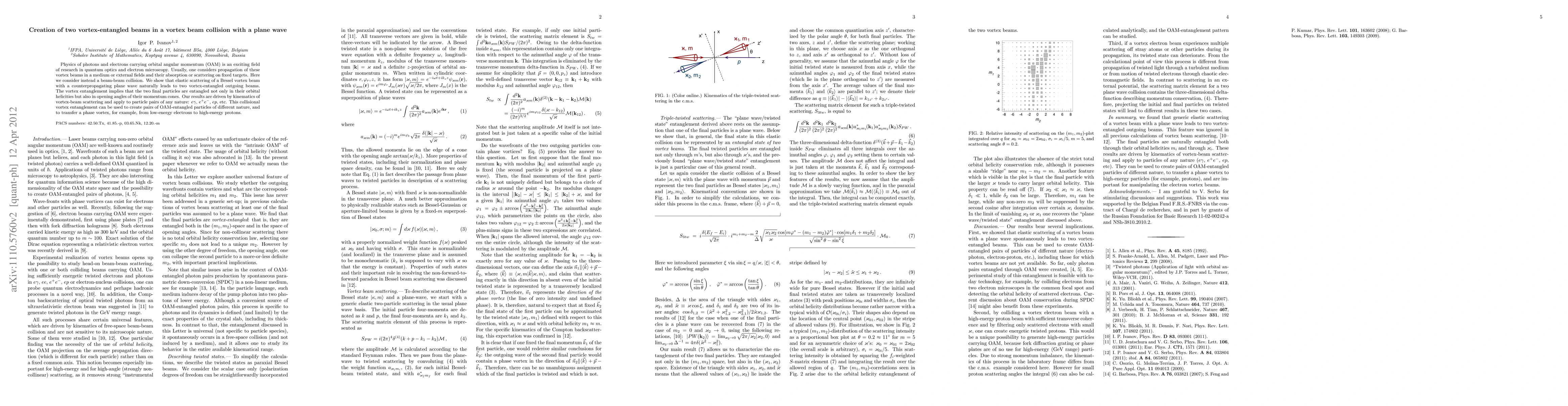 This paper demonstrates the creation of two vortex-entangled beams resulting from the collision of a Bessel vortex beam with a plane wave. The entanglement extends beyond orbital helicities, involving the opening angles of momentum cones, applicable to various particle pairs.