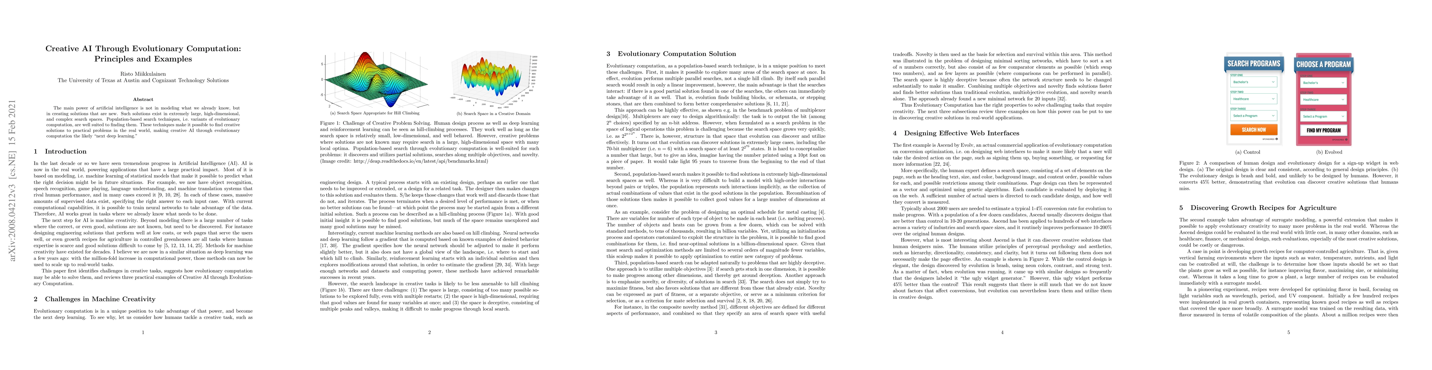 This paper explores how evolutionary computation can generate novel solutions in complex, high-dimensional search spaces, positioning population-based search techniques as a promising approach for creative AI beyond traditional deep learning. It highlights the potential of these methods to solve practical, real-world problems.