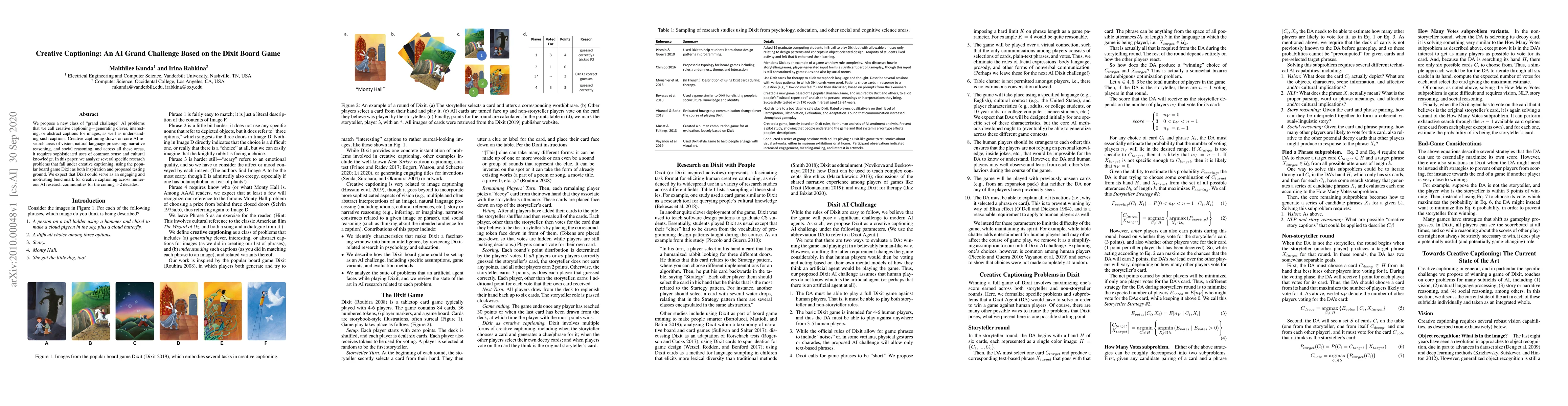We propose a new class of "grand challenge" AI problems that we call creative captioning---generating clever, interesting, or abstract captions for images, as well as understanding such captions. Creative captioning draws on core AI research areas of vision, natural language processing, narrative reasoning, and social reasoning, and across all these areas, it requires sophisticated uses of common sense and cultural knowledge. In this paper, we analyze several specific research problems that fall under creative captioning, using the popular board game Dixit as both inspiration and proposed testing ground. We expect that Dixit could serve as an engaging and motivating benchmark for creative captioning across numerous AI research communities for the coming 1-2 decades.
