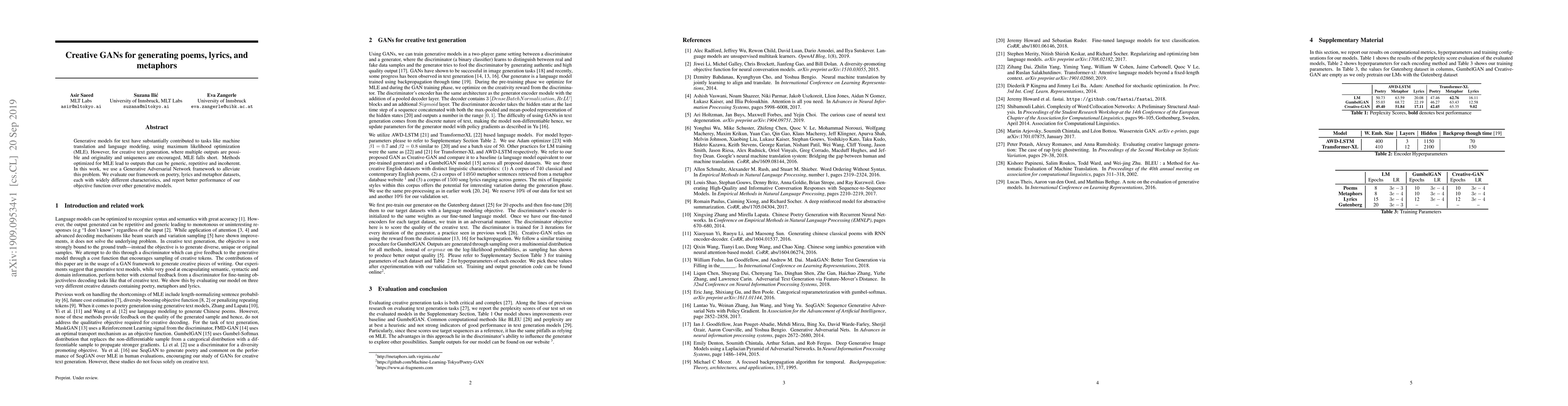 Generative models for text have substantially contributed to tasks like machine translation and language modeling, using maximum likelihood optimization (MLE). However, for creative text generation, where multiple outputs are possible and originality and uniqueness are encouraged, MLE falls short. Methods optimized for MLE lead to outputs that can be generic, repetitive and incoherent. In this work, we use a Generative Adversarial Network framework to alleviate this problem. We evaluate our framework on poetry, lyrics and metaphor datasets, each with widely different characteristics, and report better performance of our objective function over other generative models.