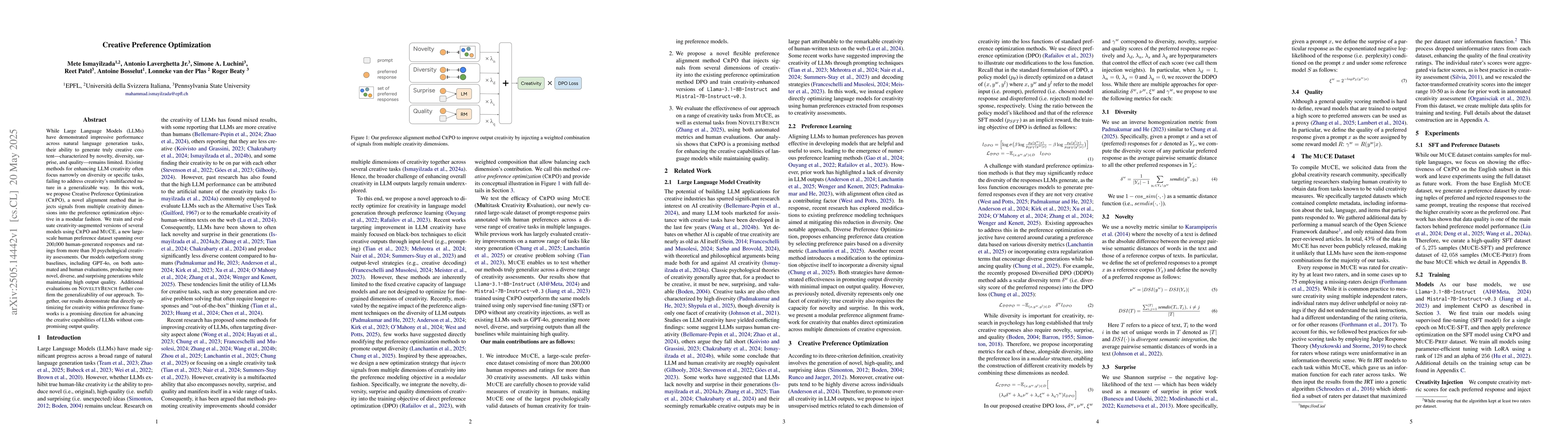 This paper introduces Creative Preference Optimization (CrPO), a method to enhance Large Language Models' creativity, producing more novel, diverse, and surprising content while maintaining high output quality.