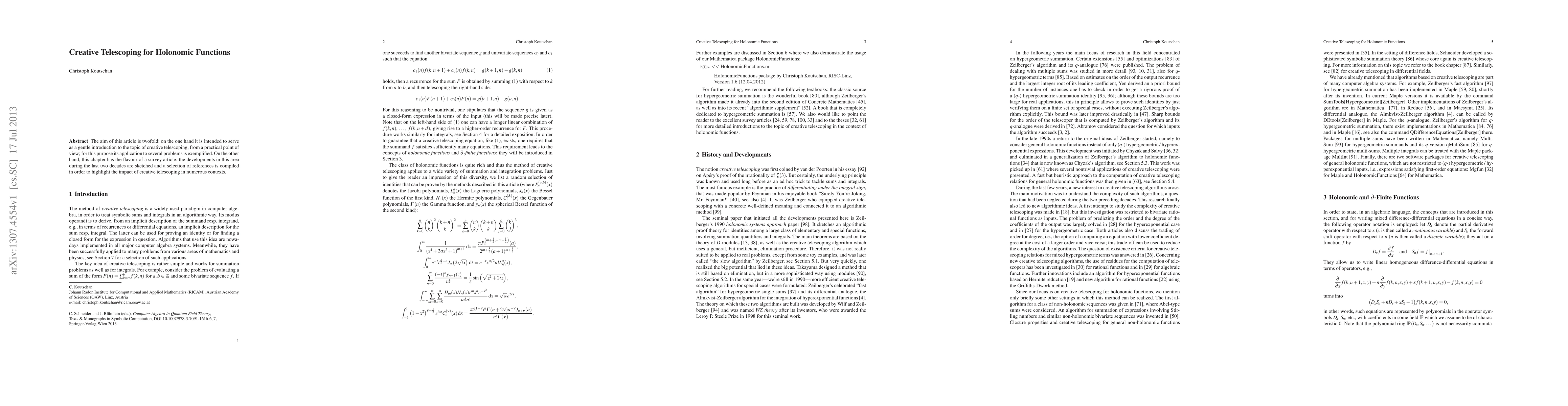 This paper provides a practical introduction to creative telescoping for holonomic functions and surveys its developments over the past two decades, showcasing its applications and compiling relevant references.