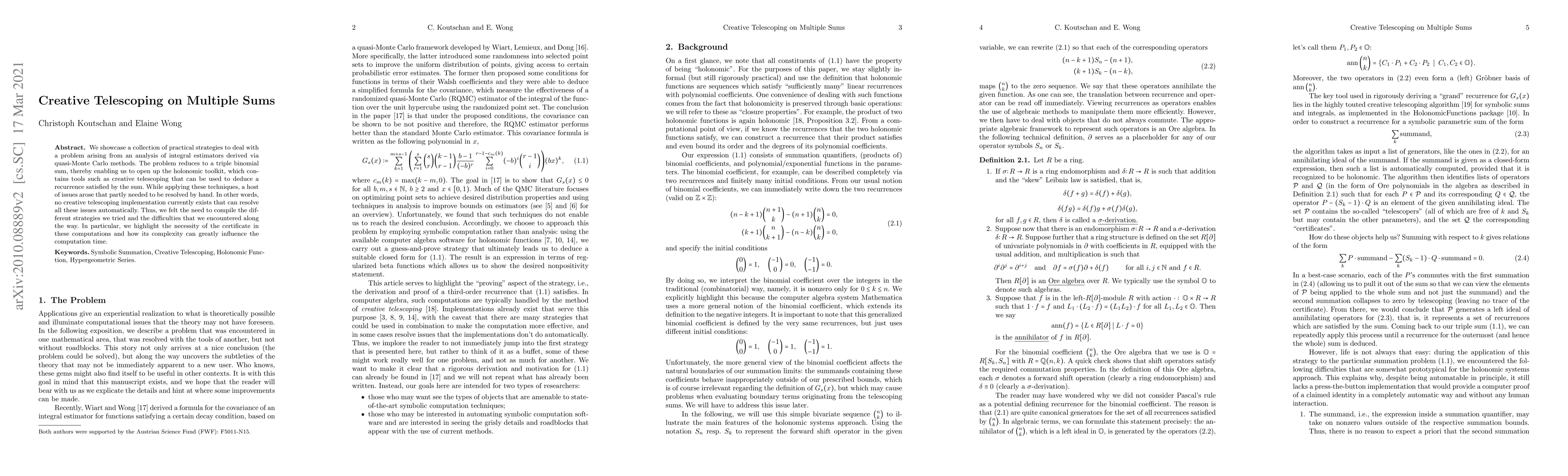 We showcase a collection of practical strategies to deal with a problem arising from an analysis of integral estimators derived via quasi-Monte Carlo methods. The problem reduces to a triple binomial sum, thereby enabling us to open up the holonomic toolkit, which contains tools such as creative telescoping that can be used to deduce a recurrence satisfied by the sum. While applying these techniques, a host of issues arose that partly needed to be resolved by hand. In other words, no creative telescoping implementation currently exists that can resolve all these issues automatically. Thus, we felt the need to compile the different strategies we tried and the difficulties that we encountered along the way. In particular, we highlight the necessity of the certificate in these computations and how its complexity can greatly influence the computation time.