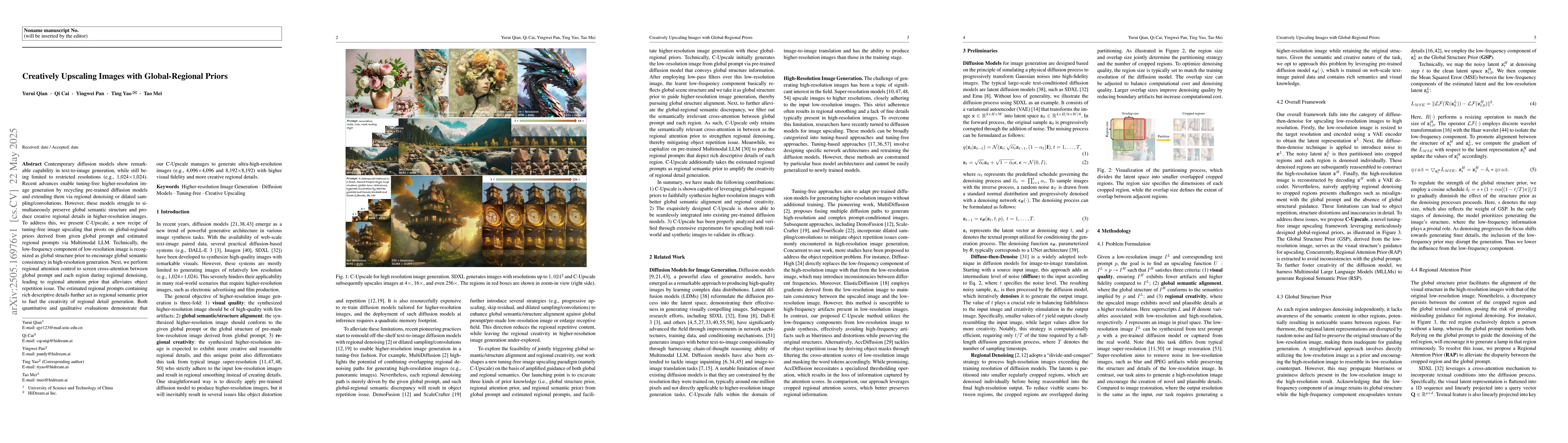 C-Upscale presents a novel tuning-free image upscaling method that integrates global-regional priors, ensuring both global semantic consistency and creative regional detail generation in higher-resolution images.