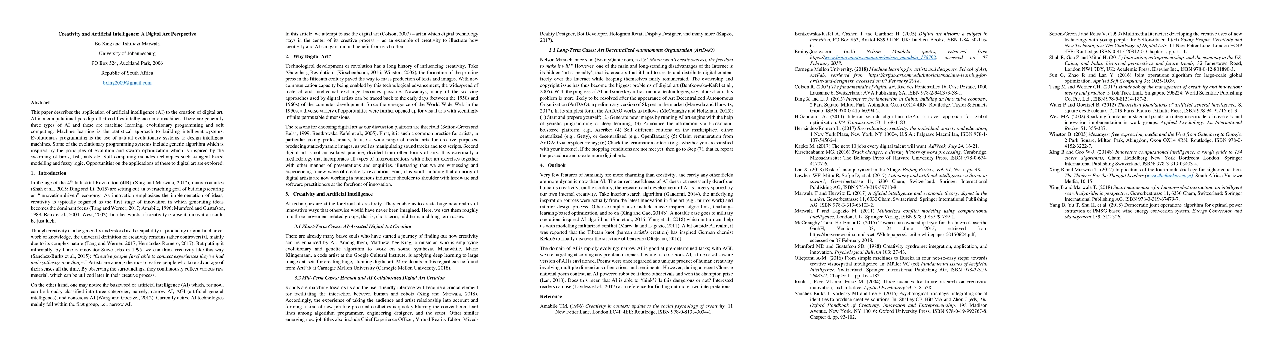 The paper categorizes AI techniques into machine learning, evolutionary programming, and soft computing, and demonstrates their applications in digital art creation, from AI-assisted to collaborative human-AI projects.