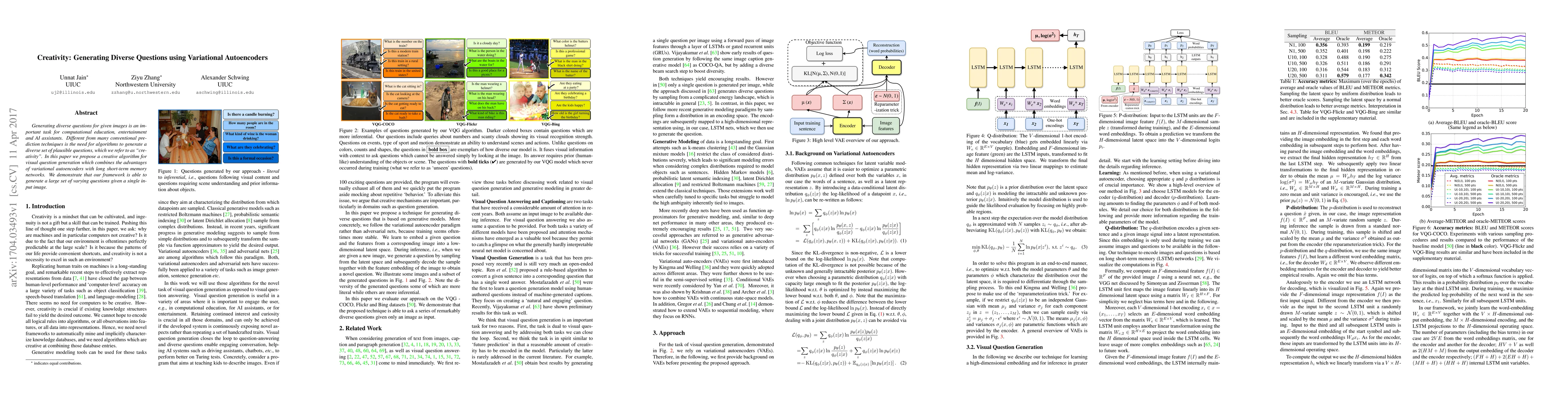 This paper proposes a creative algorithm for generating diverse questions from images using a combination of variational autoencoders and long short-term memory networks. The framework successfully produces a wide range of plausible questions for a single input image, enhancing creativity in visual question generation.