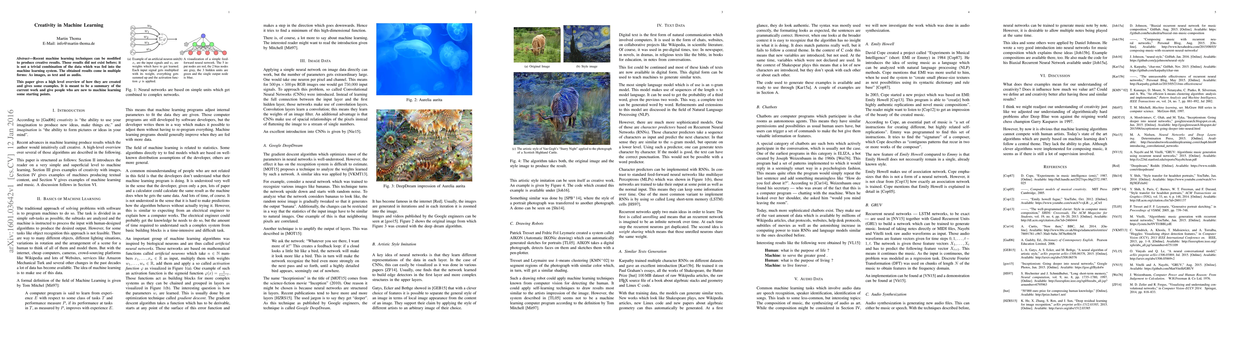 Recent machine learning techniques can be modified to produce creative results. Those results did not exist before; it is not a trivial combination of the data which was fed into the machine learning system. The obtained results come in multiple forms: As images, as text and as audio. This paper gives a high level overview of how they are created and gives some examples. It is meant to be a summary of the current work and give people who are new to machine learning some starting points.