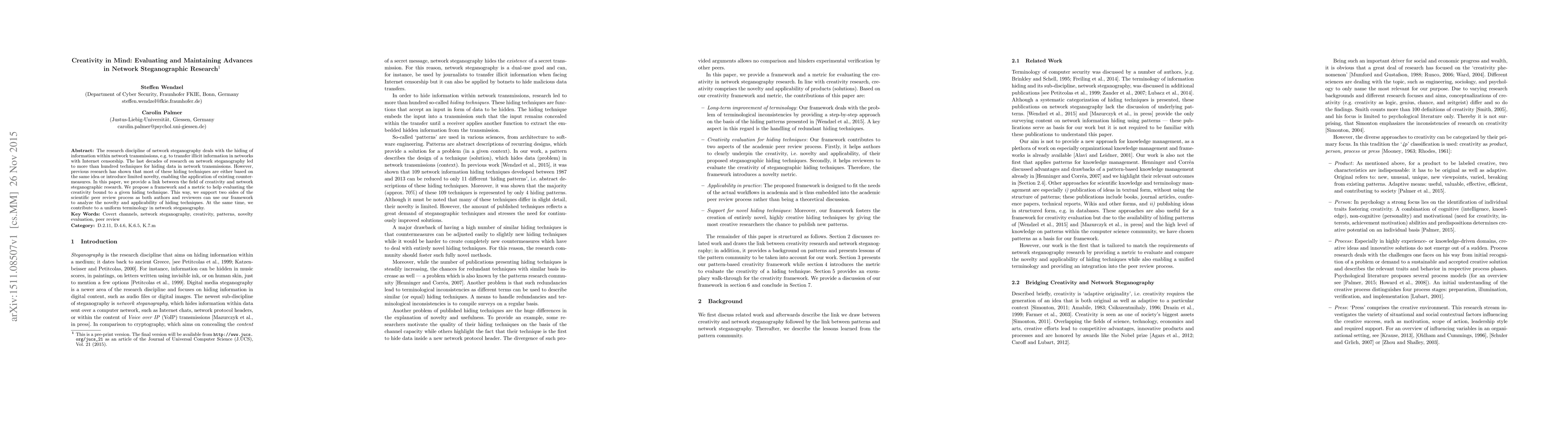 The research discipline of network steganography deals with the hiding of information within network transmissions, e.g. to transfer illicit information in networks with Internet censorship. The last decades of research on network steganography led to more than hundred techniques for hiding data in network transmissions. However, previous research has shown that most of these hiding techniques are either based on the same idea or introduce limited novelty, enabling the application of existing countermeasures. In this paper, we provide a link between the field of creativity and network steganographic research. We propose a framework and a metric to help evaluating the creativity bound to a given hiding technique. This way, we support two sides of the scientific peer review process as both authors and reviewers can use our framework to analyze the novelty and applicability of hiding techniques. At the same time, we contribute to a uniform terminology in network steganography.