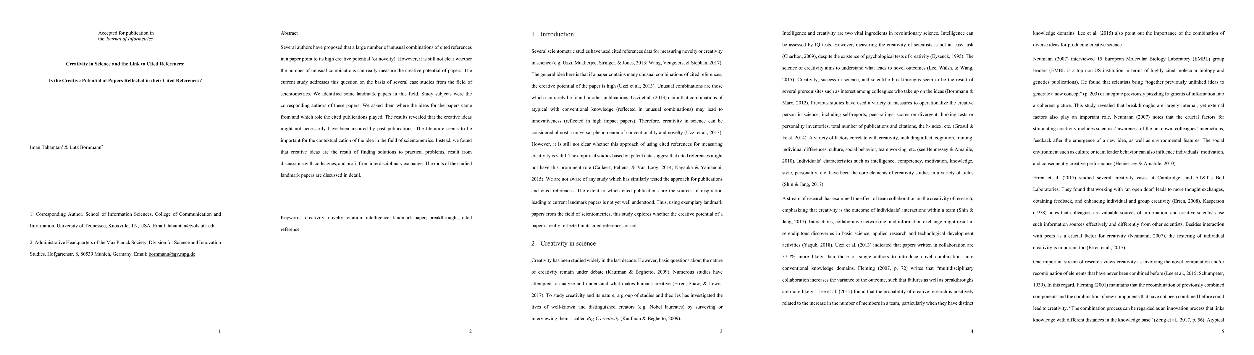 Several authors have proposed that a large number of unusual combinations of cited references in a paper point to its high creative potential (or novelty). However, it is still not clear whether the number of unusual combinations can really measure the creative potential of papers. The current study addresses this question on the basis of several case studies from the field of scientometrics. We identified some landmark papers in this field. Study subjects were the corresponding authors of these papers. We asked them where the ideas for the papers came from and which role the cited publications played. The results revealed that the creative ideas might not necessarily have been inspired by past publications. The literature seems to be important for the contextualization of the idea in the field of scientometrics. Instead, we found that creative ideas are the result of finding solutions to practical problems, result from discussions with colleagues, and profit from interdisciplinary exchange. The roots of the studied landmark papers are discussed in detail.