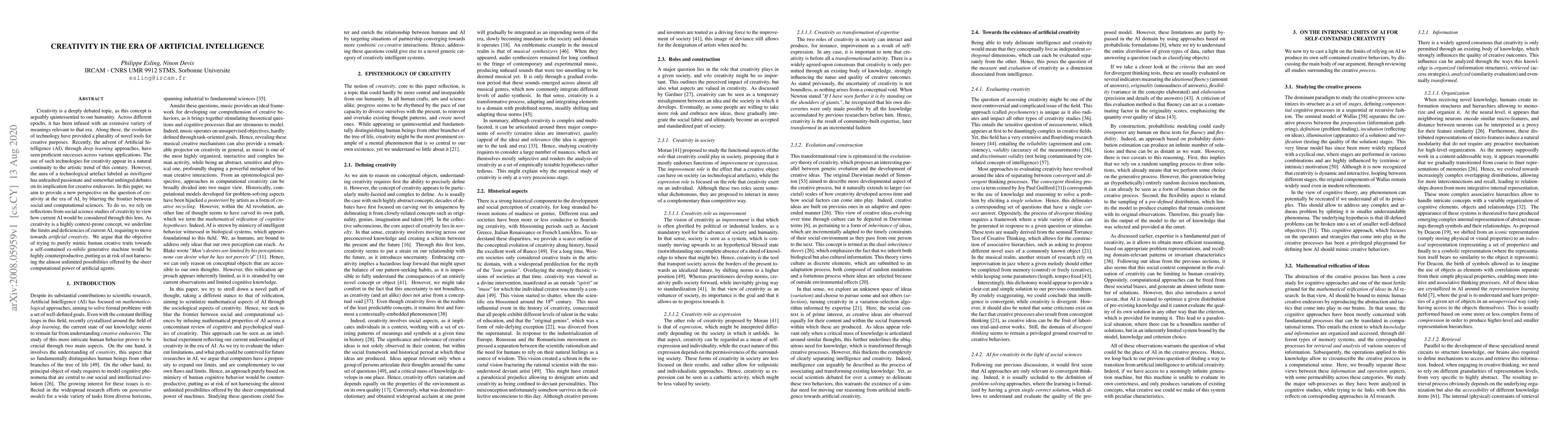 Creativity is a deeply debated topic, as this concept is arguably quintessential to our humanity. Across different epochs, it has been infused with an extensive variety of meanings relevant to that era. Along these, the evolution of technology have provided a plurality of novel tools for creative purposes. Recently, the advent of Artificial Intelligence (AI), through deep learning approaches, have seen proficient successes across various applications. The use of such technologies for creativity appear in a natural continuity to the artistic trend of this century. However, the aura of a technological artefact labeled as intelligent has unleashed passionate and somewhat unhinged debates on its implication for creative endeavors. In this paper, we aim to provide a new perspective on the question of creativity at the era of AI, by blurring the frontier between social and computational sciences. To do so, we rely on reflections from social science studies of creativity to view how current AI would be considered through this lens. As creativity is a highly context-prone concept, we underline the limits and deficiencies of current AI, requiring to move towards artificial creativity. We argue that the objective of trying to purely mimic human creative traits towards a self-contained ex-nihilo generative machine would be highly counterproductive, putting us at risk of not harnessing the almost unlimited possibilities offered by the sheer computational power of artificial agents.