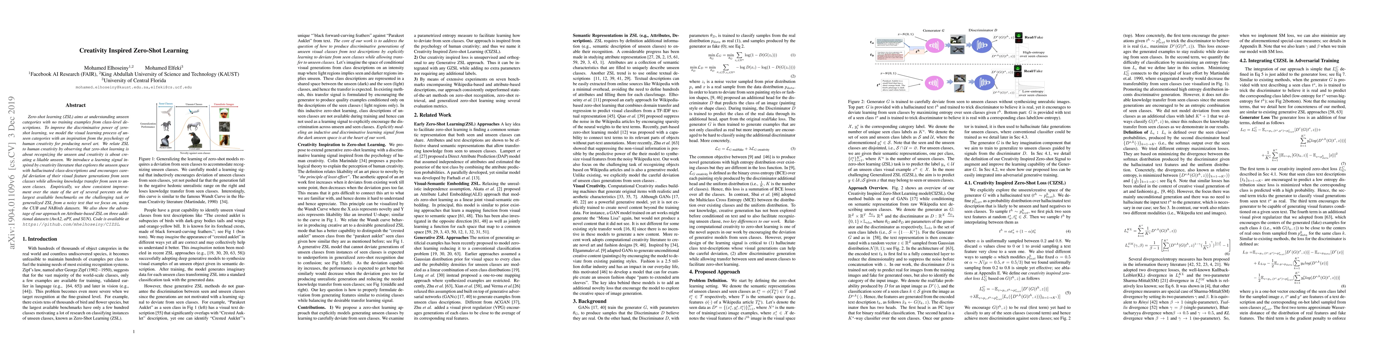This paper proposes a novel zero-shot learning approach inspired by human creativity to better recognize unseen categories. It introduces a learning signal that encourages the generation of novel visual features for unseen classes while transferring knowledge from seen classes, leading to consistent improvements on several benchmarks.