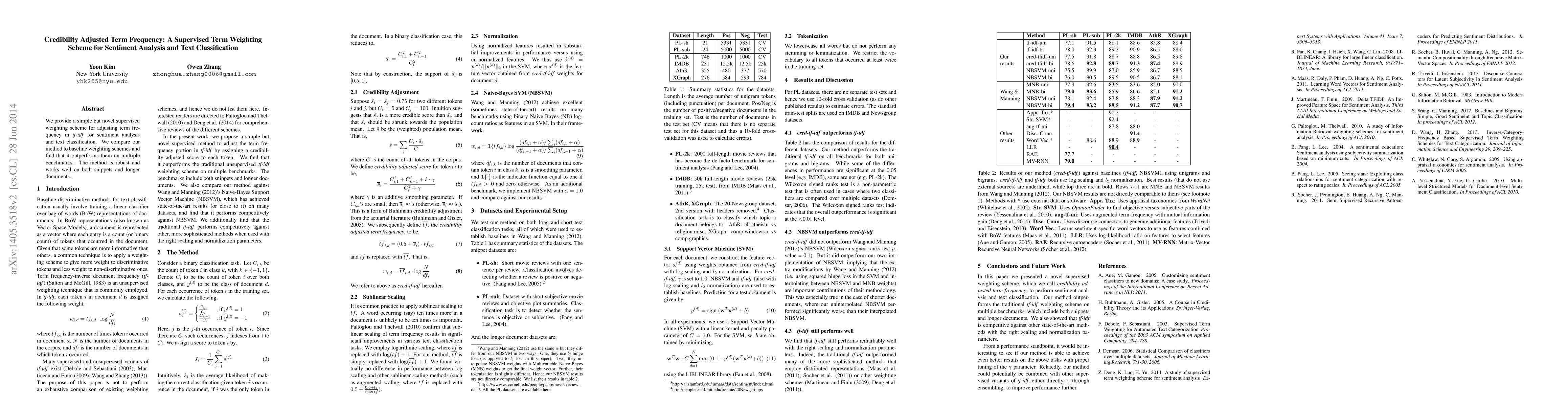 This paper introduces a new supervised term weighting scheme called Credibility Adjusted Term Frequency (CATF) to enhance tf-idf for sentiment analysis and text classification. CATF outperforms baseline methods on various benchmarks and demonstrates robust performance across different document lengths.