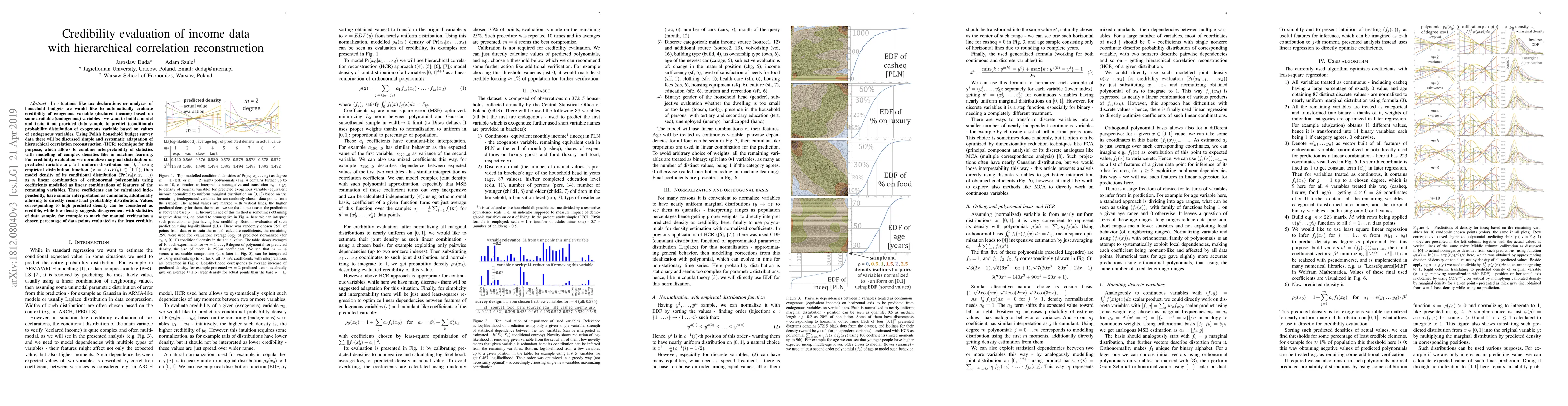 In situations like tax declarations or analyzes of household budgets we would like to automatically evaluate credibility of exogenous variable (declared income) based on some available (endogenous) variables - we want to build a model and train it on provided data sample to predict (conditional) probability distribution of exogenous variable based on values of endogenous variables. Using Polish household budget survey data there will be discussed simple and systematic adaptation of hierarchical correlation reconstruction (HCR) technique for this purpose, which allows to combine interpretability of statistics with modelling of complex densities like in machine learning. For credibility evaluation we normalize marginal distribution of predicted variable to $\rho\approx 1$ uniform distribution on $[0,1]$ using empirical distribution function $(x=EDF(y)\in[0,1])$, then model density of its conditional distribution $(\textrm{Pr}(x_0|x_1 x_2\ldots))$ as a linear combination of orthonormal polynomials using coefficients modelled as linear combinations of features of the remaining variables. These coefficients can be calculated independently, have similar interpretation as cumulants, additionally allowing to directly reconstruct probability distribution. Values corresponding to high predicted density can be considered as credible, while low density suggests disagreement with statistics of data sample, for example to mark for manual verification a chosen percentage of data points evaluated as the least credible.