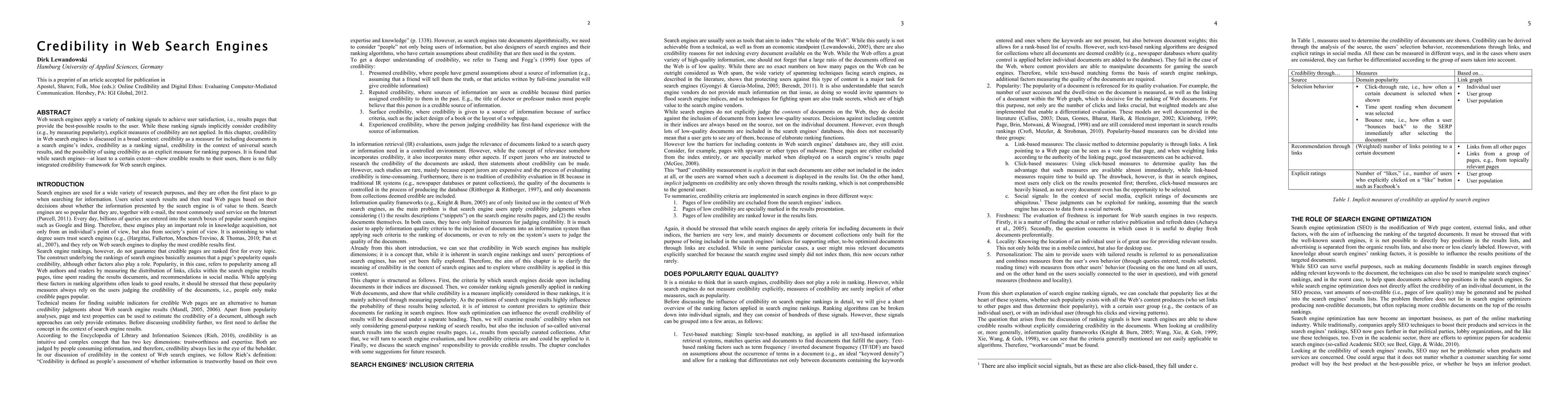 This paper explores the role of credibility in web search engines, highlighting that while implicit measures of credibility are used, there is no comprehensive framework explicitly incorporating credibility as a ranking signal or inclusion criterion, despite its potential benefits for user satisfaction.