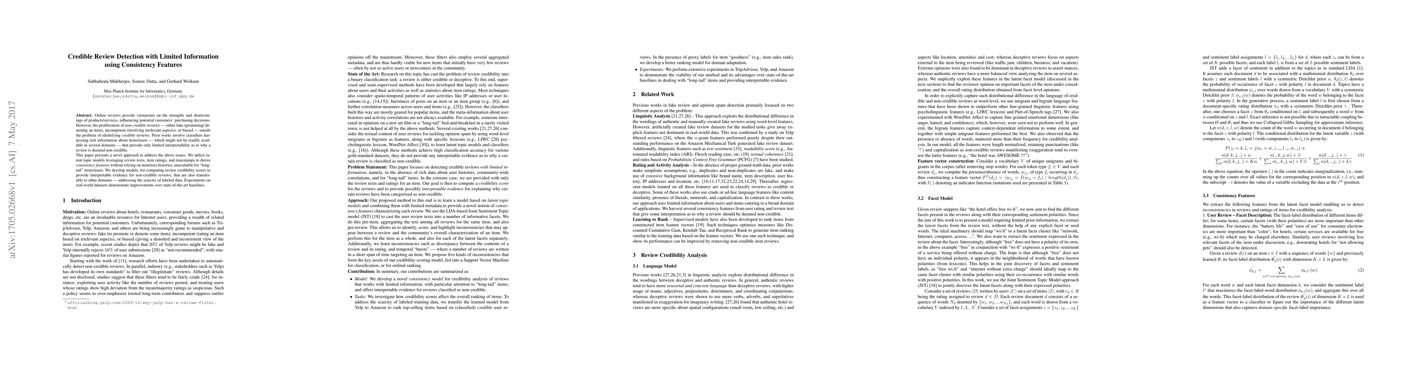 Online reviews provide viewpoints on the strengths and shortcomings of products/services, influencing potential customers' purchasing decisions. However, the proliferation of non-credible reviews -- either fake (promoting/ demoting an item), incompetent (involving irrelevant aspects), or biased -- entails the problem of identifying credible reviews. Prior works involve classifiers harnessing rich information about items/users -- which might not be readily available in several domains -- that provide only limited interpretability as to why a review is deemed non-credible. This paper presents a novel approach to address the above issues. We utilize latent topic models leveraging review texts, item ratings, and timestamps to derive consistency features without relying on item/user histories, unavailable for "long-tail" items/users. We develop models, for computing review credibility scores to provide interpretable evidence for non-credible reviews, that are also transferable to other domains -- addressing the scarcity of labeled data. Experiments on real-world datasets demonstrate improvements over state-of-the-art baselines.