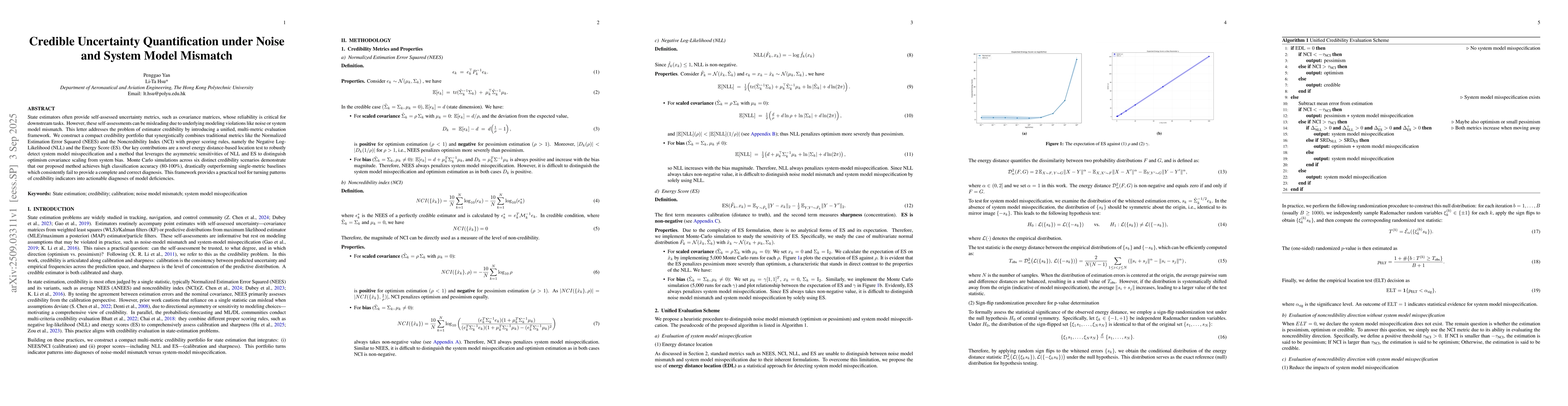 State estimators often provide self-assessed uncertainty metrics, such as covariance matrices, whose reliability is critical for downstream tasks. However, these self-assessments can be misleading due to underlying modeling violations like noise or system model mismatch. This letter addresses the problem of estimator credibility by introducing a unified, multi-metric evaluation framework. We construct a compact credibility portfolio that synergistically combines traditional metrics like the Normalized Estimation Error Squared (NEES) and the Noncredibility Index (NCI) with proper scoring rules, namely the Negative Log-Likelihood (NLL) and the Energy Score (ES). Our key contributions are a novel energy distance-based location test to robustly detect system model misspecification and a method that leverages the asymmetric sensitivities of NLL and ES to distinguish optimism covariance scaling from system bias. Monte Carlo simulations across six distinct credibility scenarios demonstrate that our proposed method achieves high classification accuracy (80-100%), drastically outperforming single-metric baselines which consistently fail to provide a complete and correct diagnosis. This framework provides a practical tool for turning patterns of credibility indicators into actionable diagnoses of model deficiencies.
