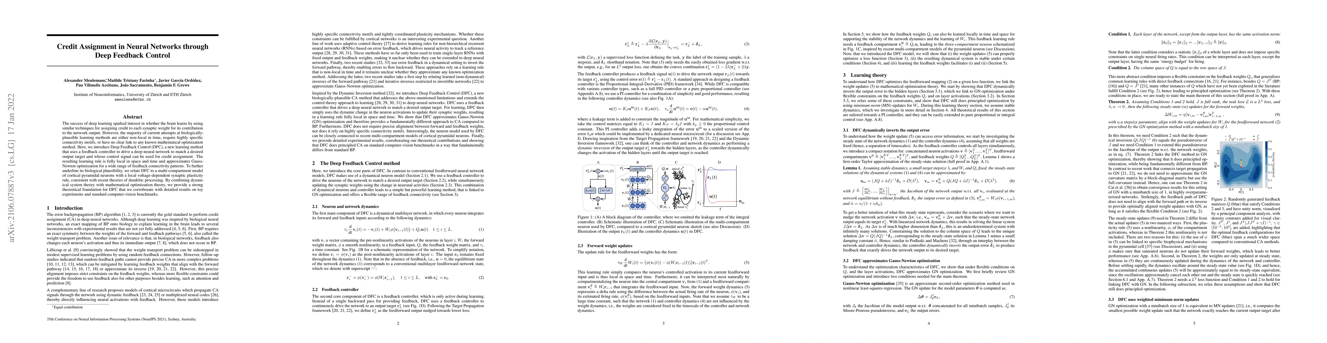 This paper introduces Deep Feedback Control (DFC), a novel learning method for neural networks that uses a feedback controller to match desired outputs, enabling local credit assignment. DFC approximates Gauss-Newton optimization and is biologically plausible, linked to cortical pyramidal neurons' dynamics and synaptic plasticity.