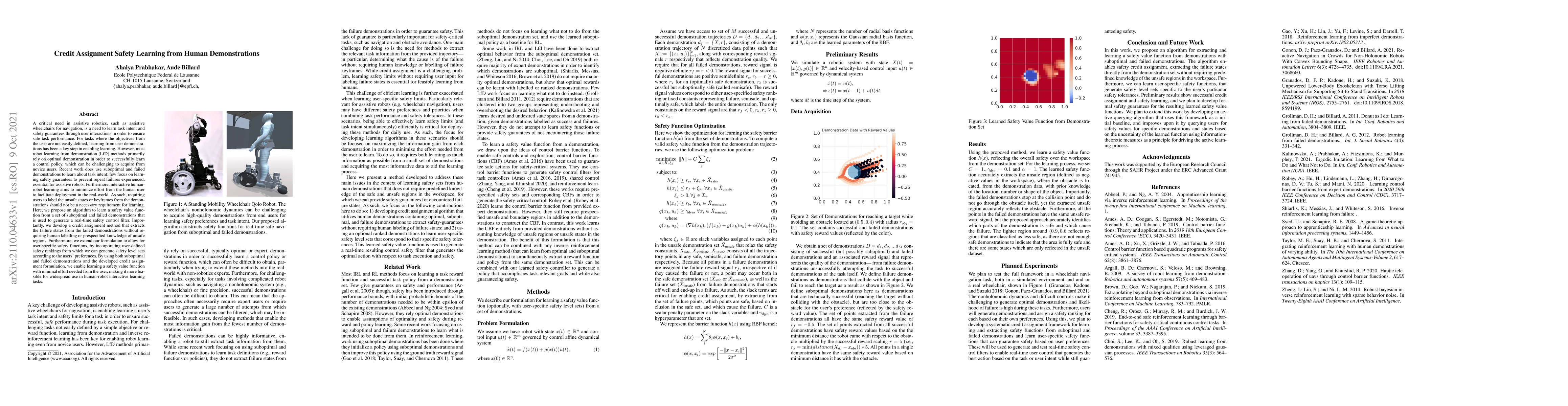 This paper proposes an algorithm for learning safety value functions from suboptimal and failed human demonstrations to enable safe task performance in assistive robots, without requiring human labeling of unsafe states. It introduces a credit assignment method to identify failure states and extends the approach to user-specific safety functions based on user-defined safety rankings.