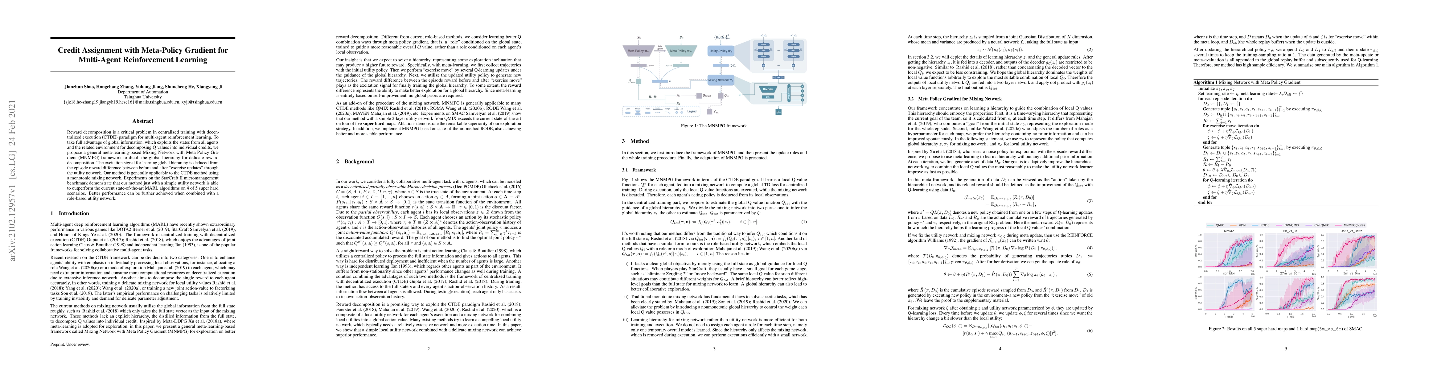 This paper proposes a meta-learning-based Mixing Network with Meta Policy Gradient (MNMPG) framework for multi-agent reinforcement learning, which decomposes global rewards into individual agent credits using a utility network. The method outperforms current state-of-the-art algorithms on challenging StarCraft II scenarios, especially when enhanced with a role-based utility network.