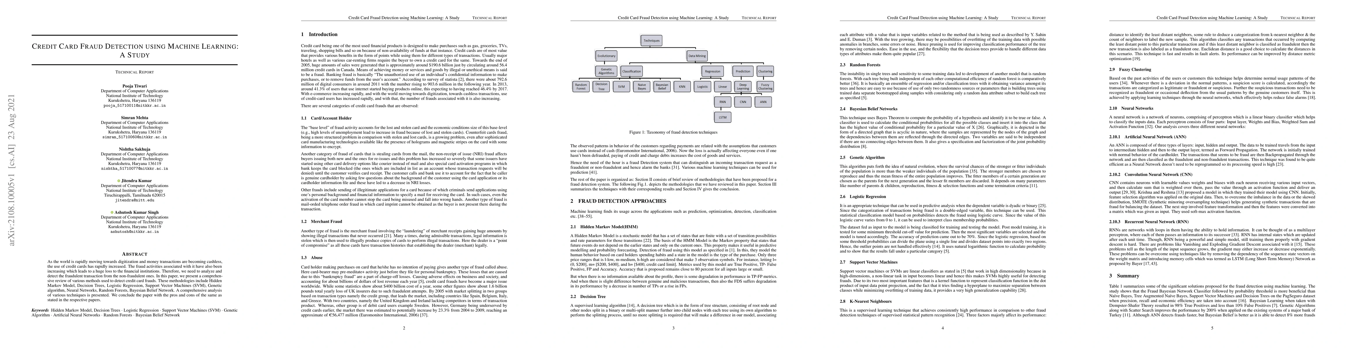 As the world is rapidly moving towards digitization and money transactions are becoming cashless, the use of credit cards has rapidly increased. The fraud activities associated with it have also been increasing which leads to a huge loss to the financial institutions. Therefore, we need to analyze and detect the fraudulent transaction from the non-fraudulent ones. In this paper, we present a comprehensive review of various methods used to detect credit card fraud. These methodologies include Hidden Markov Model, Decision Trees, Logistic Regression, Support Vector Machines (SVM), Genetic algorithm, Neural Networks, Random Forests, Bayesian Belief Network. A comprehensive analysis of various techniques is presented. We conclude the paper with the pros and cons of the same as stated in the respective papers.