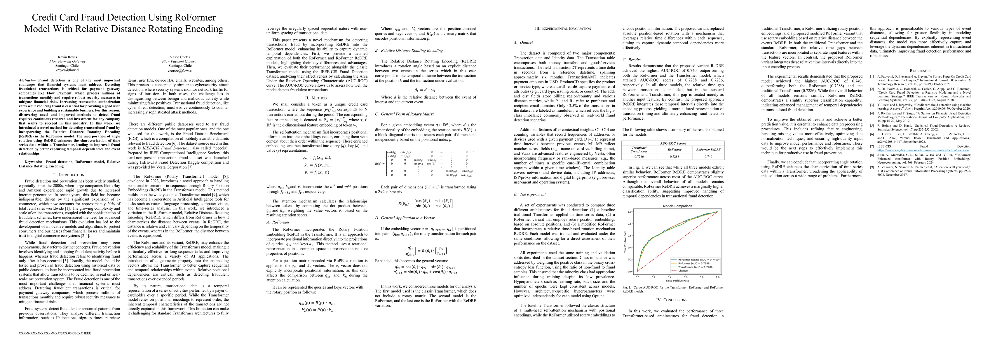 Fraud detection is one of the most important challenges that financial systems must address. Detecting fraudulent transactions is critical for payment gateway companies like Flow Payment, which process millions of transactions monthly and require robust security measures to mitigate financial risks. Increasing transaction authorization rates while reducing fraud is essential for providing a good user experience and building a sustainable business. For this reason, discovering novel and improved methods to detect fraud requires continuous research and investment for any company that wants to succeed in this industry. In this work, we introduced a novel method for detecting transactional fraud by incorporating the Relative Distance Rotating Encoding (ReDRE) in the RoFormer model. The incorporation of angle rotation using ReDRE enhances the characterization of time series data within a Transformer, leading to improved fraud detection by better capturing temporal dependencies and event relationships.