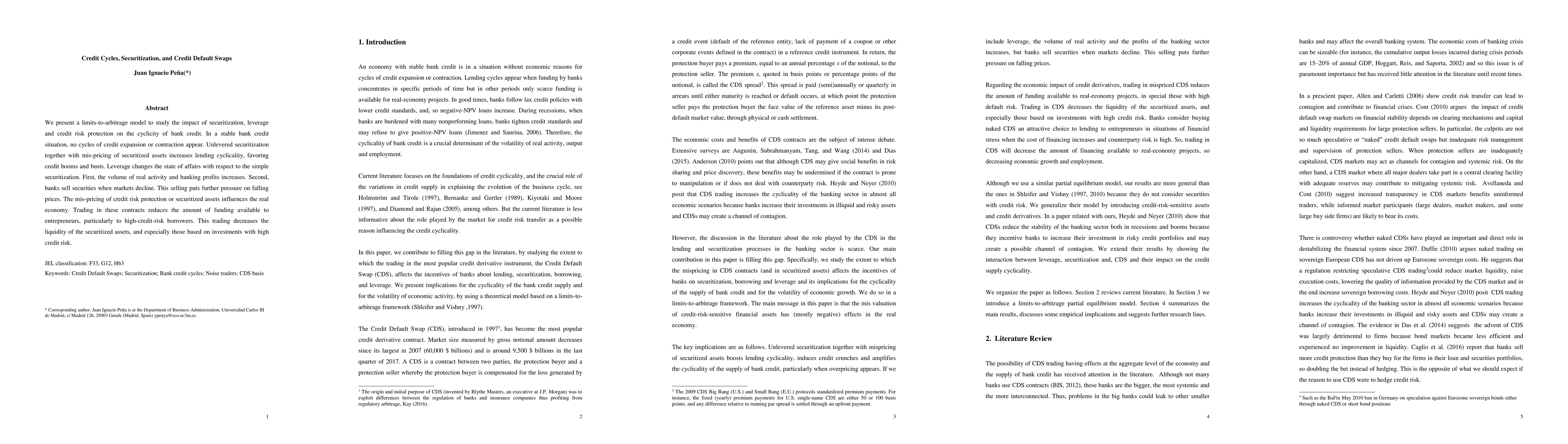 This paper uses a limits-to-arbitrage model to explore how securitization, leverage, and credit default swaps affect bank credit cycles. It finds that unlevered securitization and mis-pricing can lead to credit booms and busts, while leverage increases real activity and banking profits, but also exacerbates market declines.