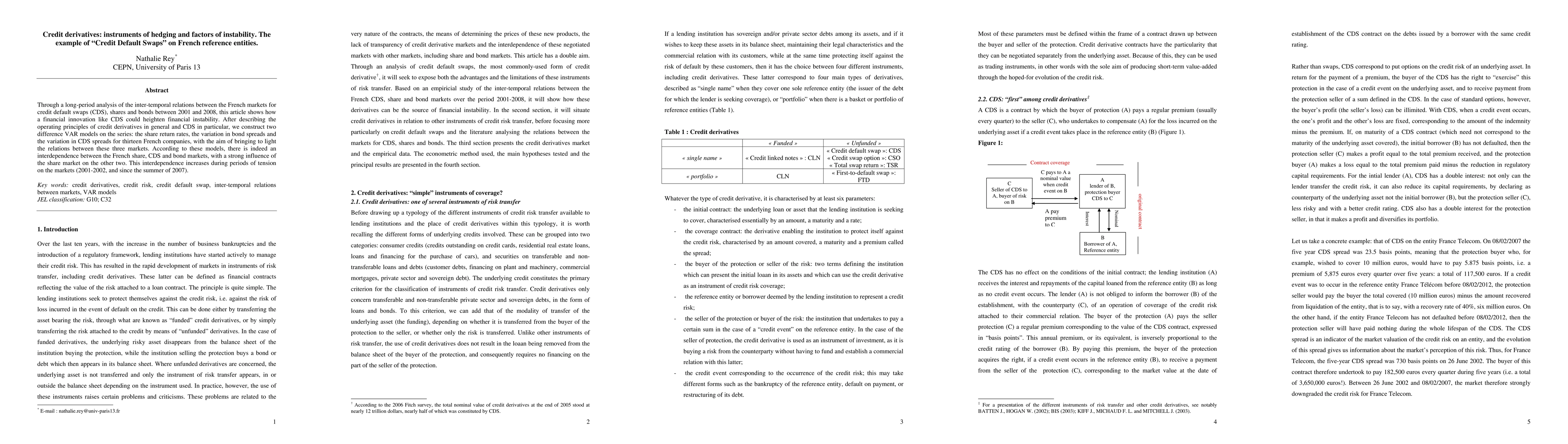 Through a long-period analysis of the inter-temporal relations between the French markets for credit default swaps (CDS), shares and bonds between 2001 and 2008, this article shows how a financial innovation like CDS could heighten financial instability. After describing the operating principles of credit derivatives in general and CDS in particular, we construct two difference VAR models on the series: the share return rates, the variation in bond spreads and the variation in CDS spreads for thirteen French companies, with the aim of bringing to light the relations between these three markets. According to these models, there is indeed an interdependence between the French share, CDS and bond markets, with a strong influence of the share market on the other two. This interdependence increases during periods of tension on the markets (2001-2002, and since the summer of 2007).