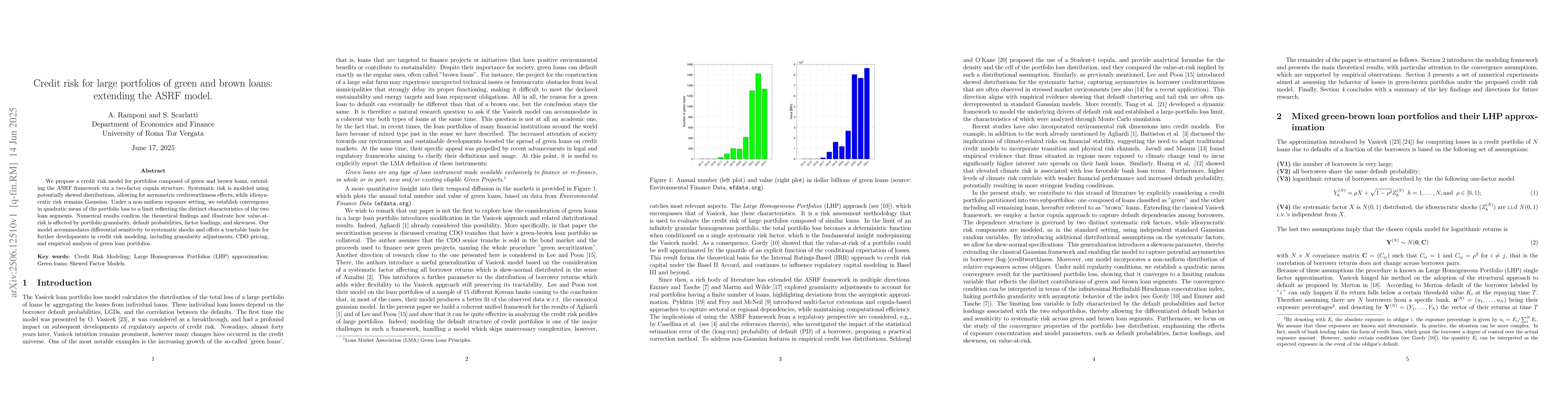 We propose a credit risk model for portfolios composed of green and brown loans, extending the ASRF framework via a two-factor copula structure. Systematic risk is modeled using potentially skewed distributions, allowing for asymmetric creditworthiness effects, while idiosyncratic risk remains Gaussian. Under a non-uniform exposure setting, we establish convergence in quadratic mean of the portfolio loss to a limit reflecting the distinct characteristics of the two loan segments. Numerical results confirm the theoretical findings and illustrate how value-at-risk is affected by portfolio granularity, default probabilities, factor loadings, and skewness. Our model accommodates differential sensitivity to systematic shocks and offers a tractable basis for further developments in credit risk modeling, including granularity adjustments, CDO pricing, and empirical analysis of green loan portfolios.