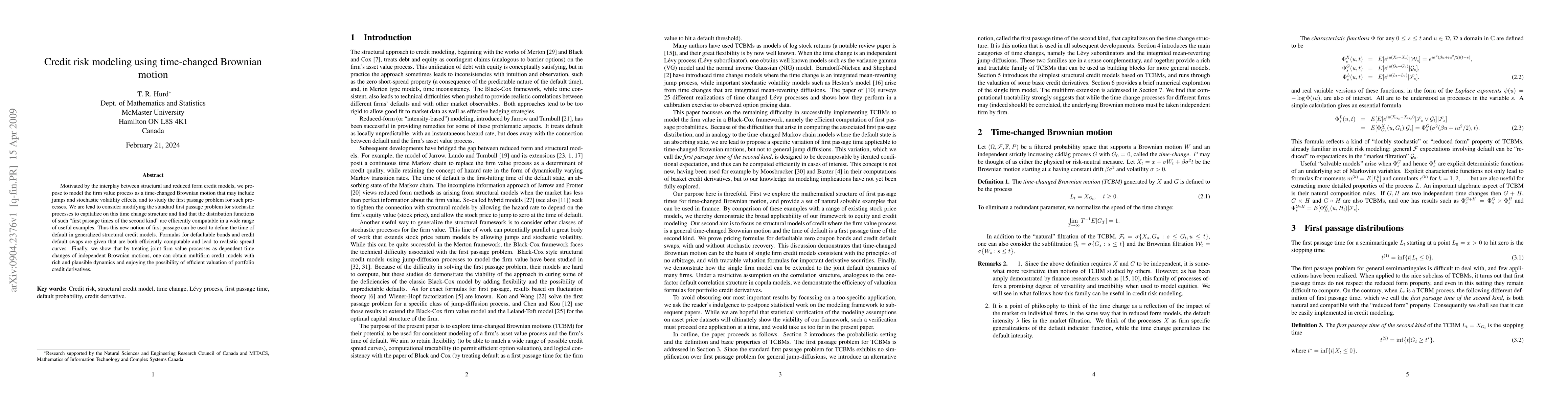 This paper proposes a time-changed Brownian motion model for firm value processes, incorporating jumps and stochastic volatility, to enhance credit risk modeling. It introduces a modified first passage problem for these time-changed processes, enabling efficient computation of default times and realistic spread curves for defaultable bonds and credit default swaps.