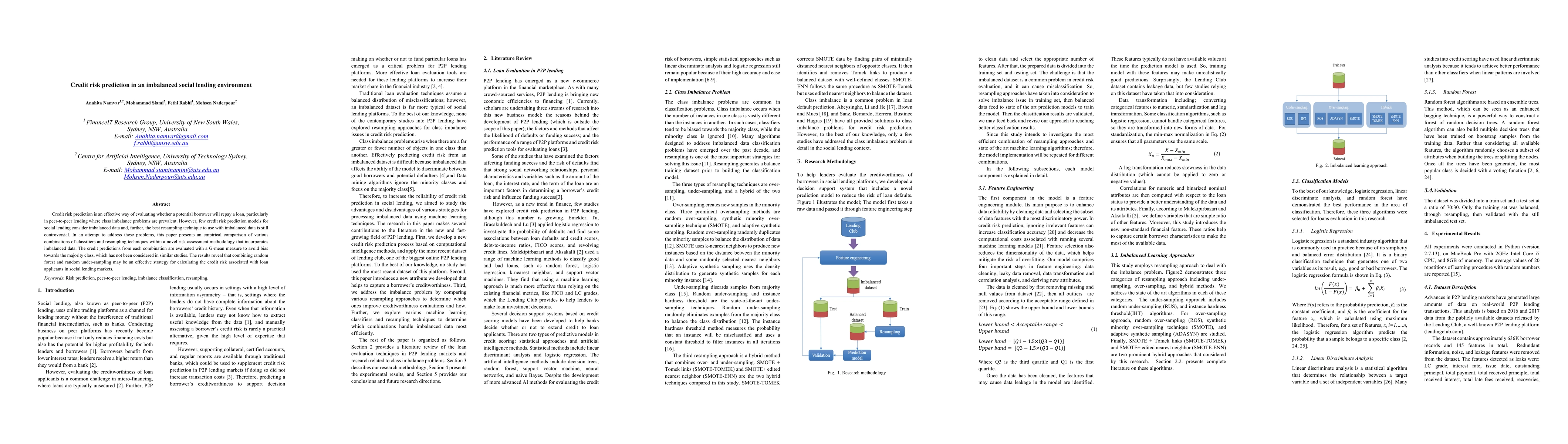 This paper evaluates various combinations of classifiers and resampling techniques for credit risk prediction in imbalanced social lending data, using a G-mean measure to assess performance. The study finds that a combination of random forest and random under-sampling is effective for predicting credit risk in peer-to-peer lending.