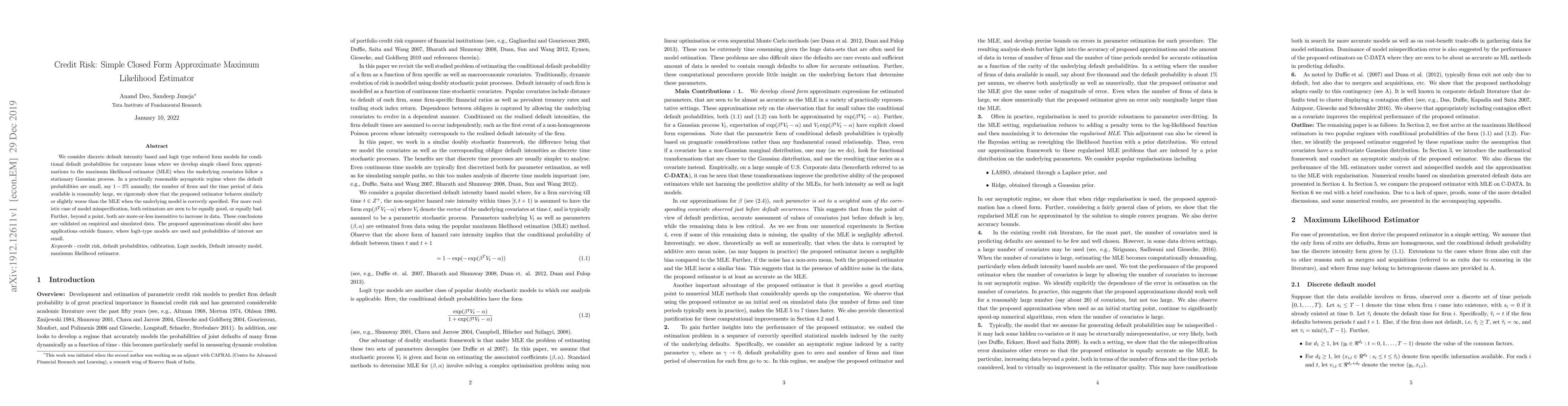 We consider discrete default intensity based and logit type reduced form models for conditional default probabilities for corporate loans where we develop simple closed form approximations to the maximum likelihood estimator (MLE) when the underlying covariates follow a stationary Gaussian process. In a practically reasonable asymptotic regime where the default probabilities are small, say 1-3% annually, the number of firms and the time period of data available is reasonably large, we rigorously show that the proposed estimator behaves similarly or slightly worse than the MLE when the underlying model is correctly specified. For more realistic case of model misspecification, both estimators are seen to be equally good, or equally bad. Further, beyond a point, both are more-or-less insensitive to increase in data. These conclusions are validated on empirical and simulated data. The proposed approximations should also have applications outside finance, where logit-type models are used and probabilities of interest are small.