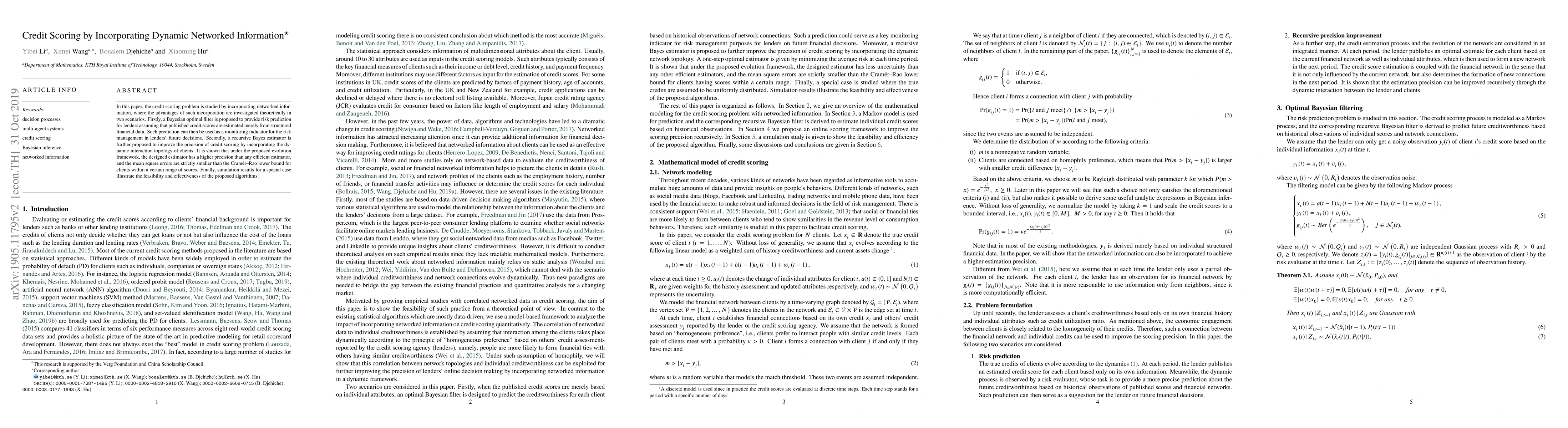This paper proposes methods to enhance credit scoring by integrating networked information, utilizing a Bayesian optimal filter for risk prediction and a recursive Bayes estimator for dynamic interaction topology, demonstrating improved precision and lower mean square errors compared to traditional methods. Simulation results confirm the feasibility and effectiveness of the proposed algorithms.