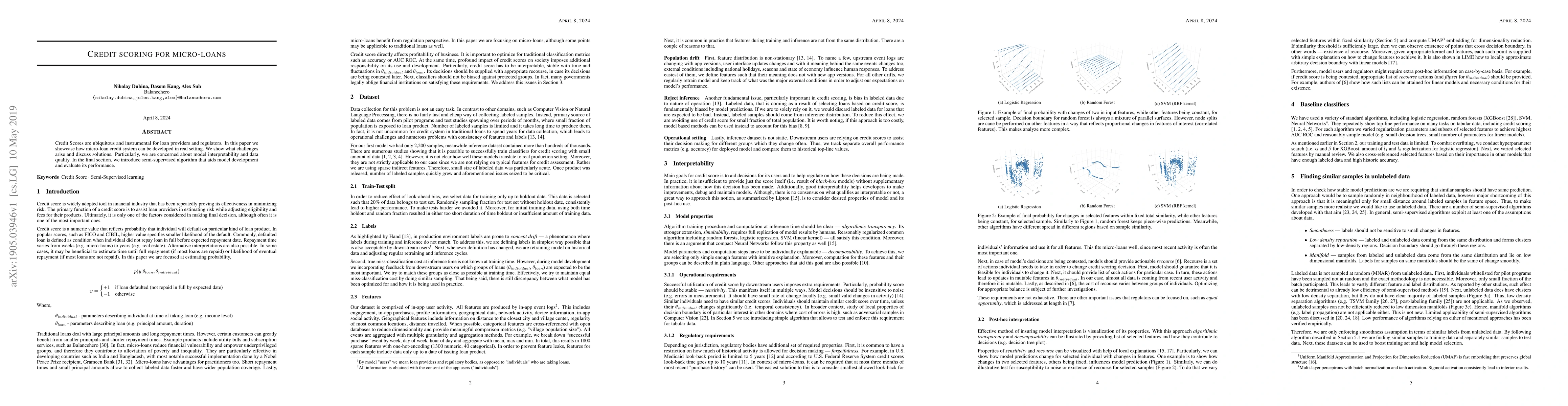 Credit Scores are ubiquitous and instrumental for loan providers and regulators. In this paper we showcase how micro-loan credit system can be developed in real setting. We show what challenges arise and discuss solutions. Particularly, we are concerned about model interpretability and data quality. In the final section, we introduce semi-supervised algorithm that aids model development and evaluate its performance